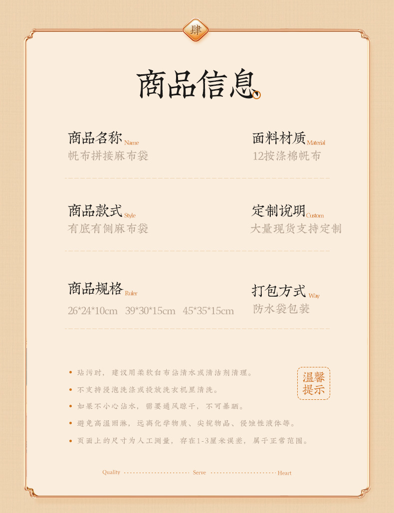 品牌: 佩玖 自重: 200-500 主要销售地区: 非洲 是否跨境出口专供货源: 是 误差: 1-3cm 货号: 创凯052 用途: 通用包装 是否进口: 否 款式: 麻布托特包 风格: 简约现代 底面侧面: 有底有侧 印刷工艺: 热转印 产地: 温州 供货类型: 可定制 加印LOGO: 是 颜色: 可定制 颜色: 可定制 材质: 12安涤棉 重量: 0.1 kg/个
