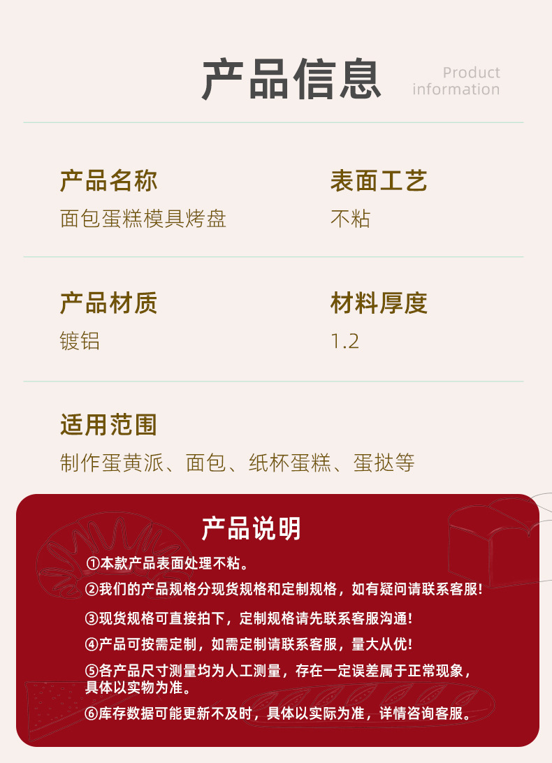 3、本公司烤盘主要为铝合金、镀铝材质,不粘涂层工艺,法式烤盘、手工盘,吐司盒等系列产品尺寸可根据客户要求定制,欢迎咨询客服选购