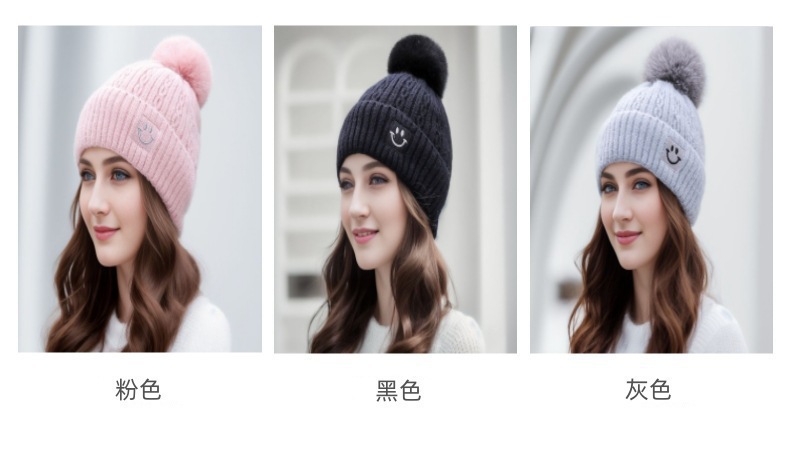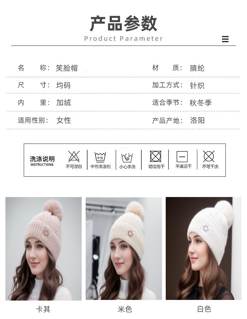 产品类别: 针织帽 功能: 保暖,防风 面料名称: 涤纶 主面料成分: 涤纶 处理工艺: 针织,纯手工 品牌: 布禧韵 风格: 百搭,优雅,极简,休闲风,简约,高级感 货号: 笑脸大球帽 流行元素: 爱心/心形 适合季节: 冬季 产地: 洛阳 帽顶款式: 圆顶 帽檐款式: 无檐 颜色: 粉色,灰色,卡其,米色,黑色,白色 是否跨境出口专供货源: 是 主要下游平台: 其他 主要销售地区: 其他 上市年份/季节: 2023年秋冬 风格分类: 时尚通勤 流行元素分类: 形状/图案