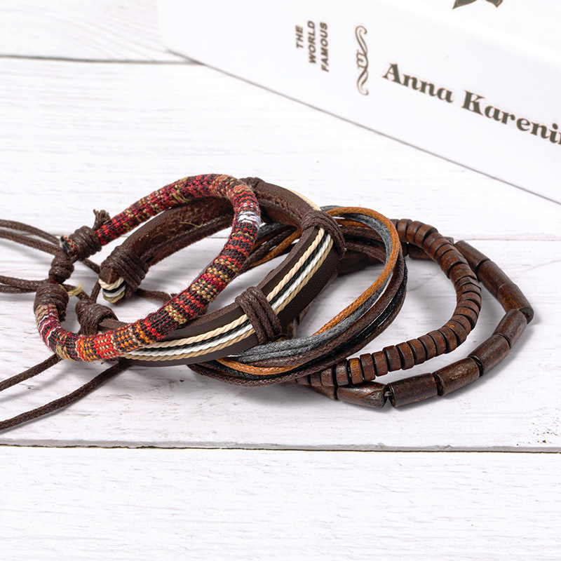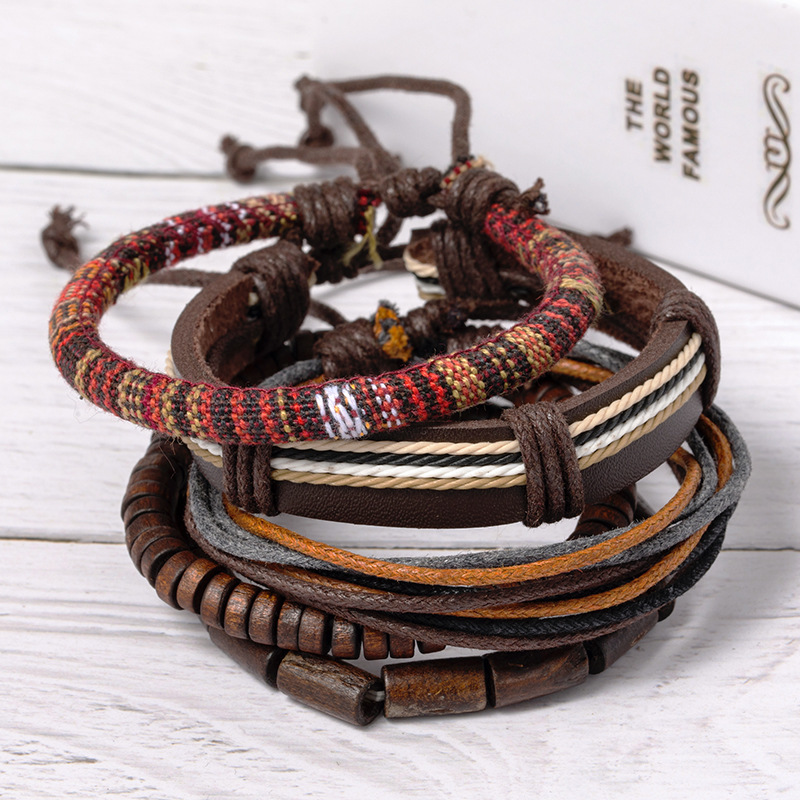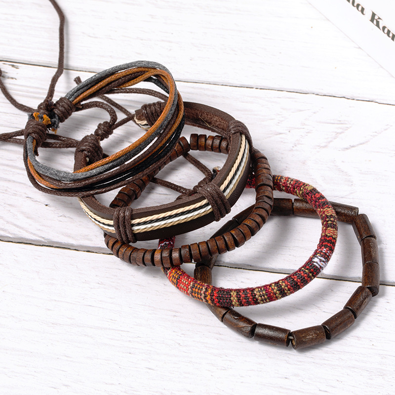 速卖通跨境爆款货源复古多件套手工编制手链优质木珠蜡绳牛皮饰品