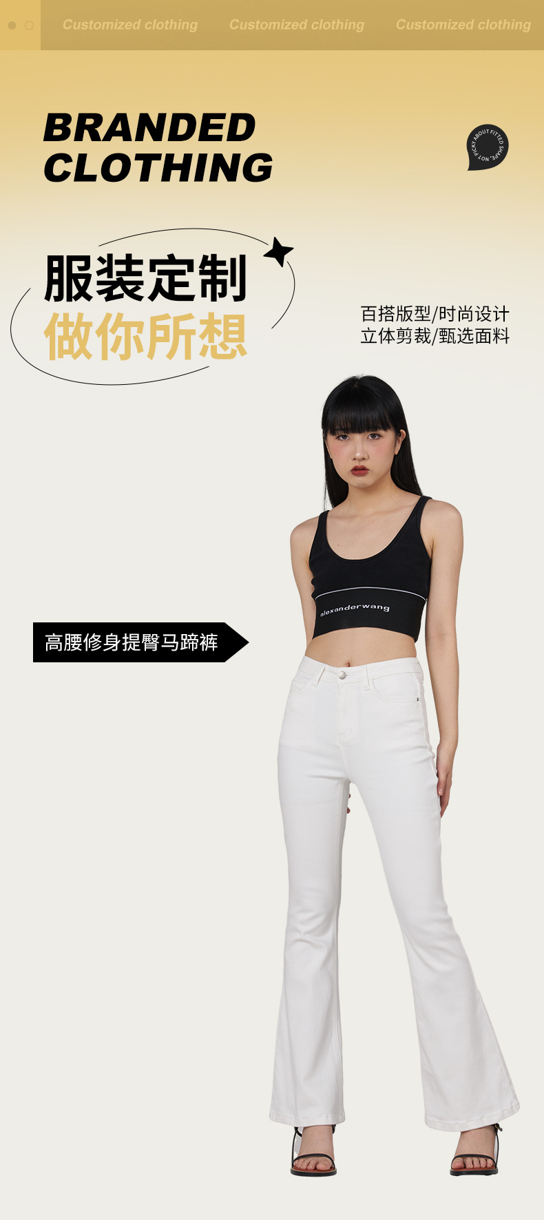 白色马蹄裤女高腰修身款喇叭裤显高显瘦休闲风提臀女装牛仔裤批发 English | 投诉