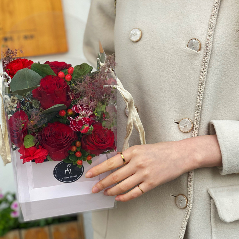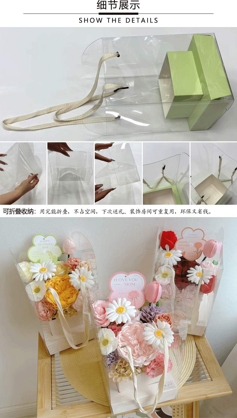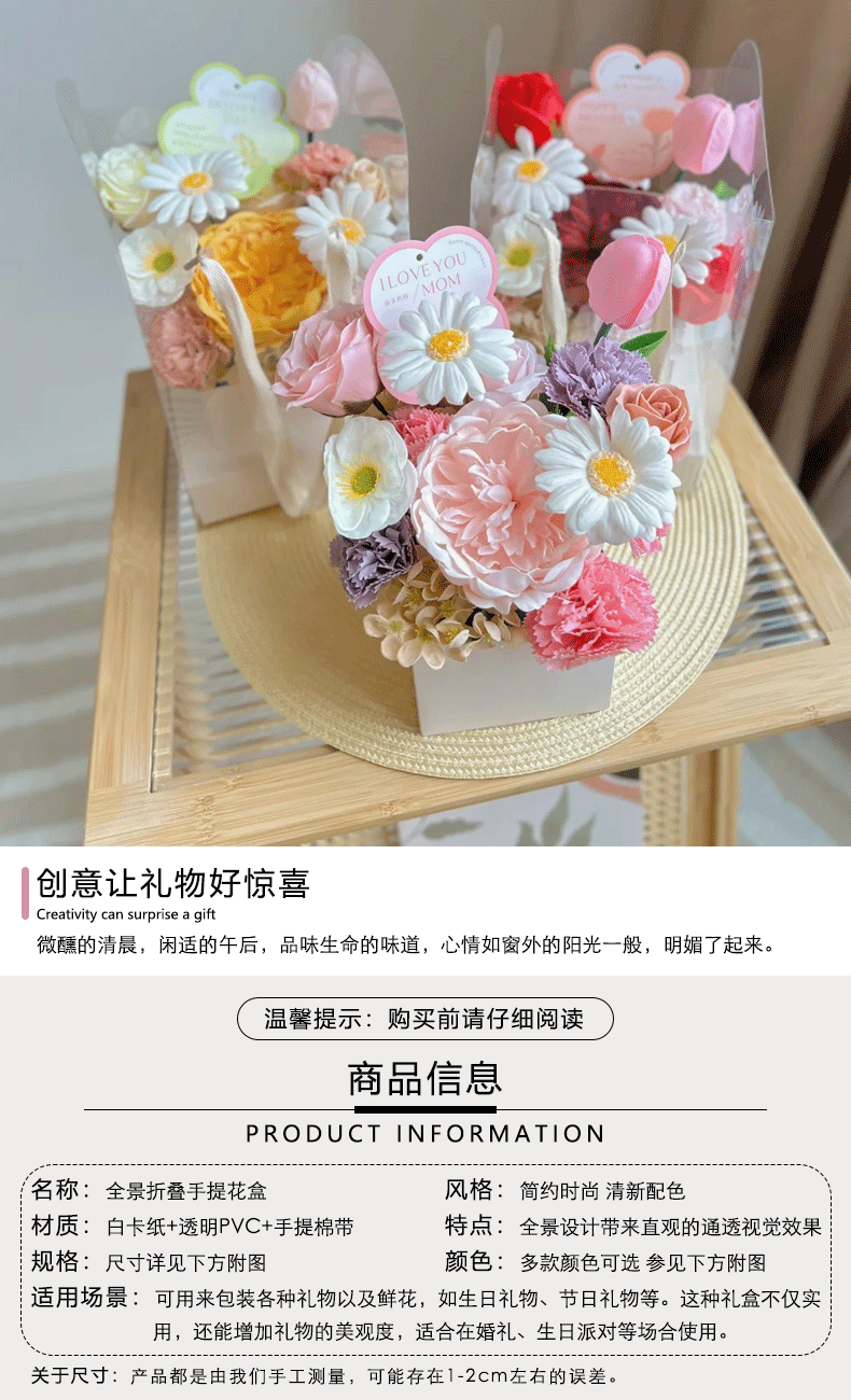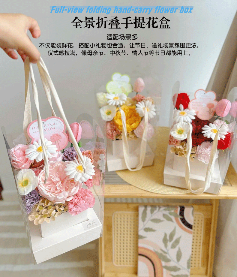 手提透明折叠鲜花盒文简约纯色插花盒七夕情人节花艺花店鲜花礼盒 English | 投诉