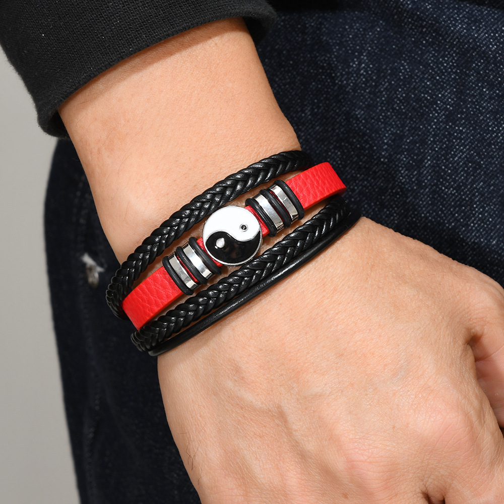 欧美跨境货源时尚朋克风多层男士太极八卦手环磁扣皮手链饰品批发