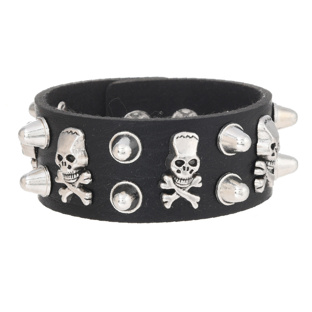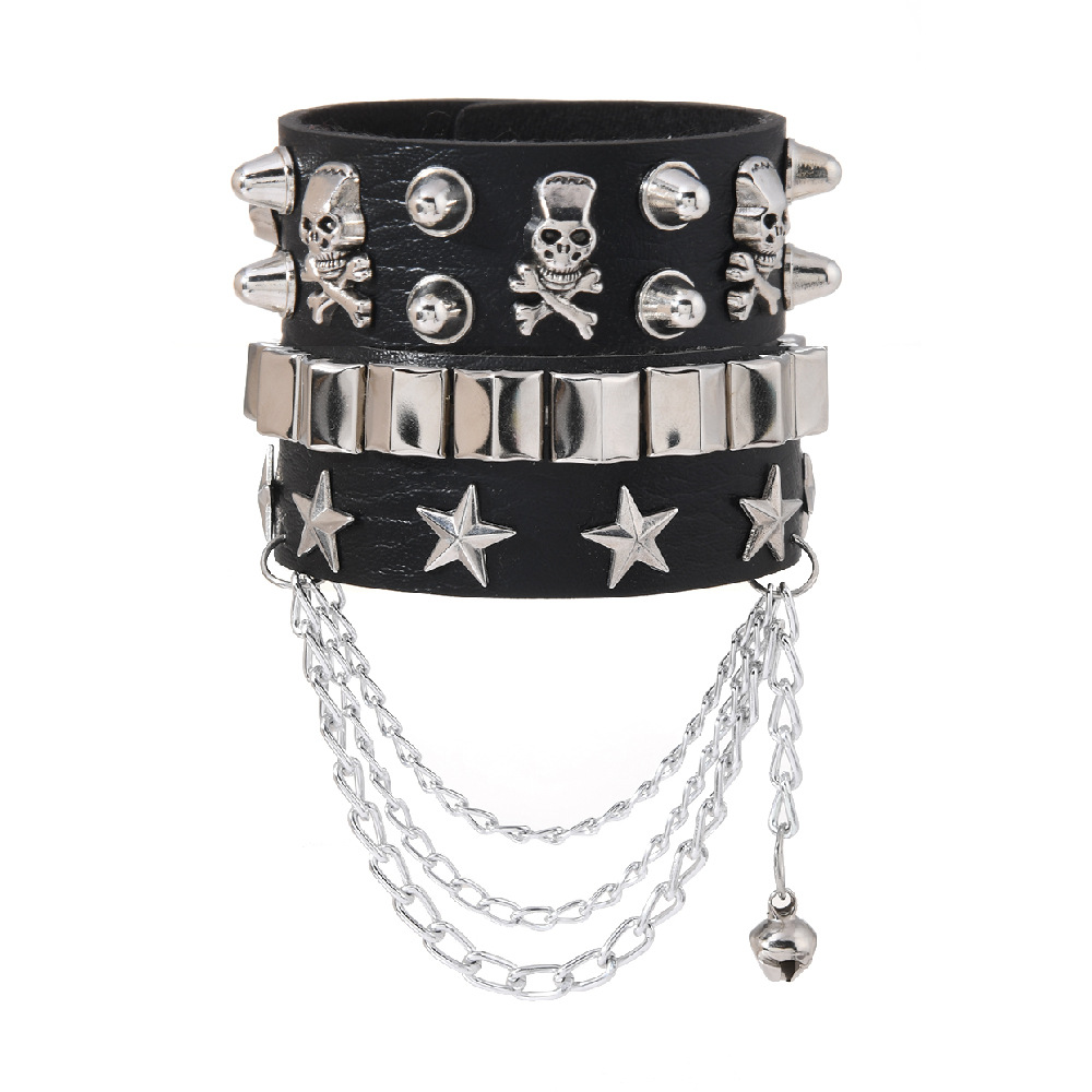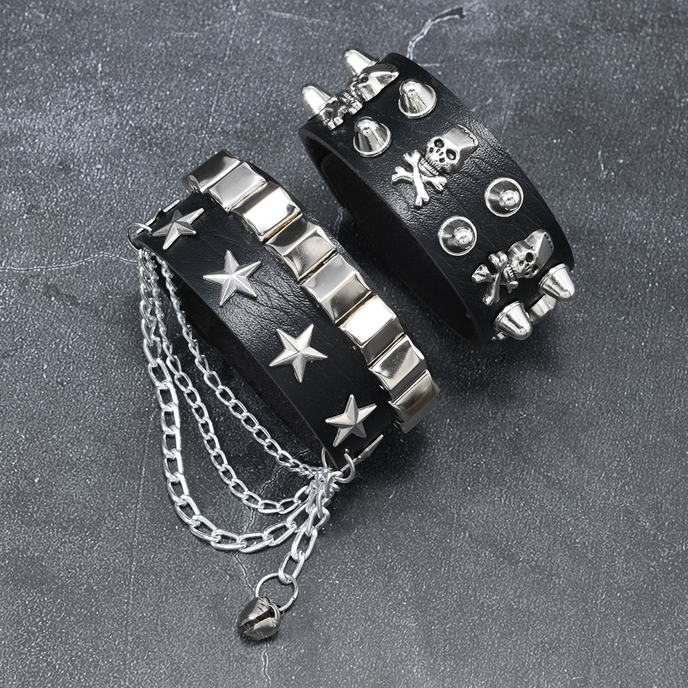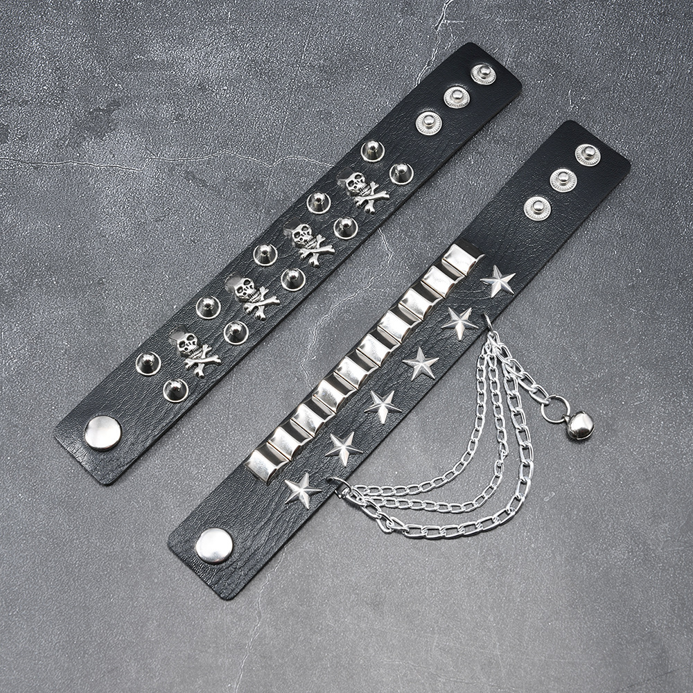 黑色皮革手链 朋克骷髅星星铆钉装饰 链条设计 可调节男女通用手