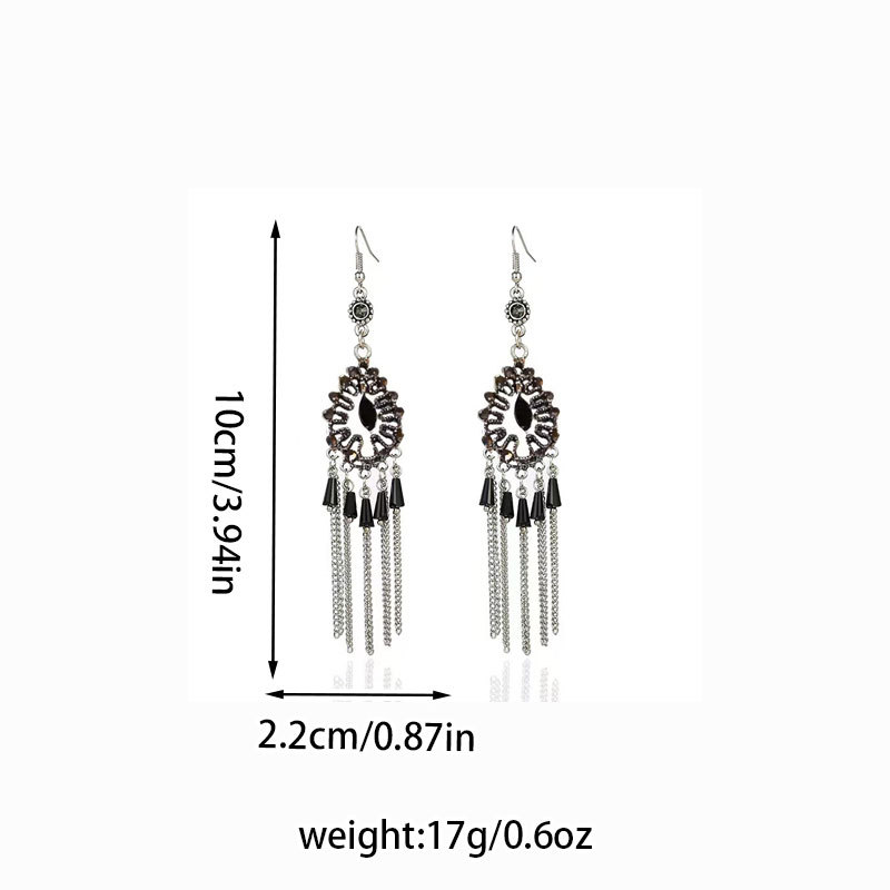 材质: 合金 处理工艺: 镶钻 品牌: 庆合饰品 流行元素: 流苏,排钻 风格: 民族风 货号: S4641 造型: 水滴形 产地: 义乌 颜色: S4641黑色流苏耳钩款 有可授权的自有品牌: 是 是否跨境出口专供货源: 是 上市年份/季节: 2025年春季 风格分类: 文艺复古 适用人群: 女式 流行元素分类: 形状/图案 重量: 0.156 kg/对