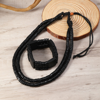 波西米亚红黄绿扁珠木珠项链手链组合二件套装 男士首饰串珠饰品