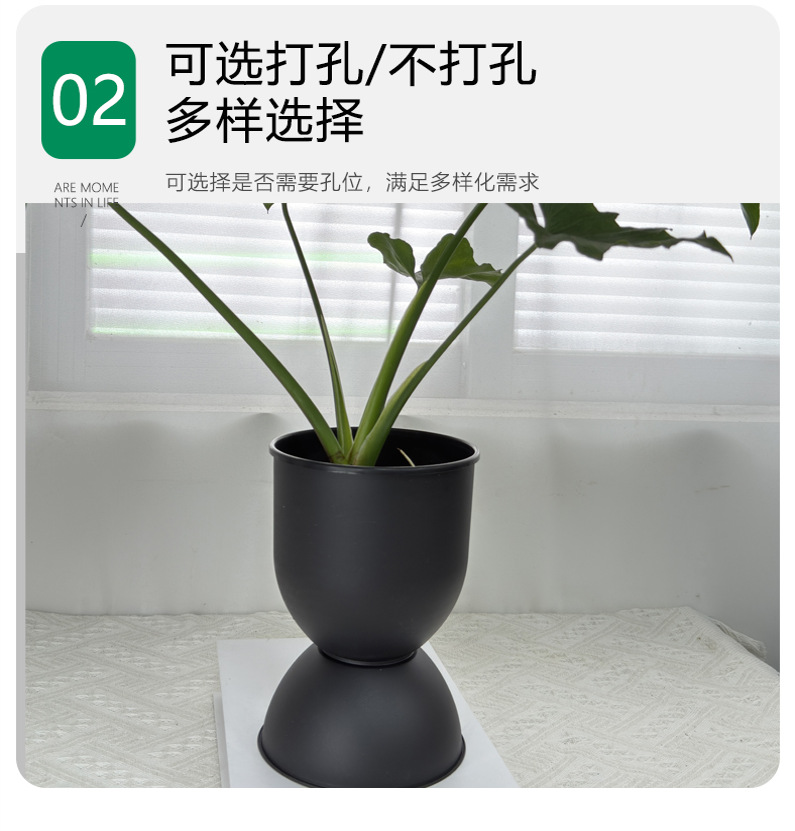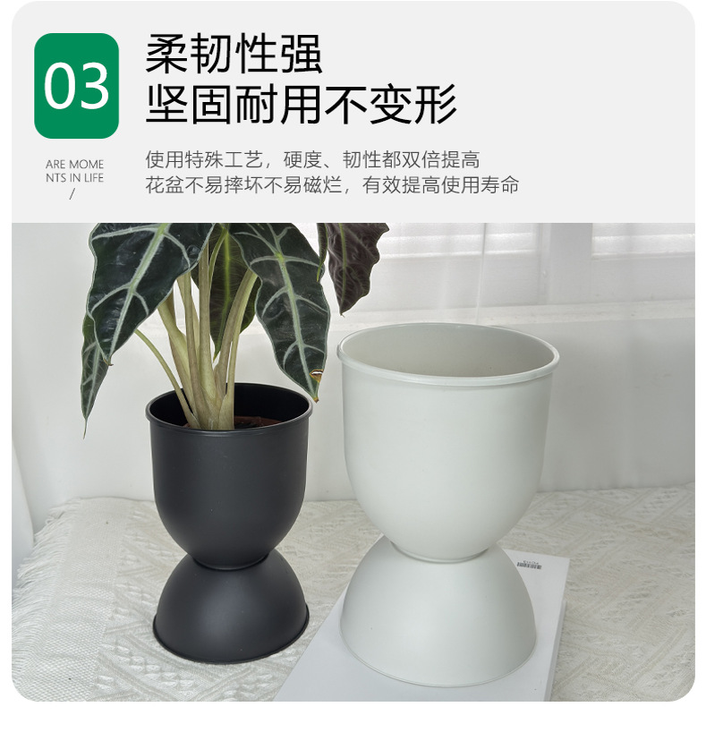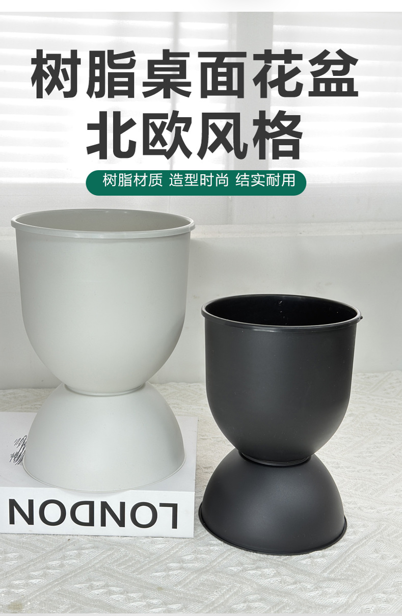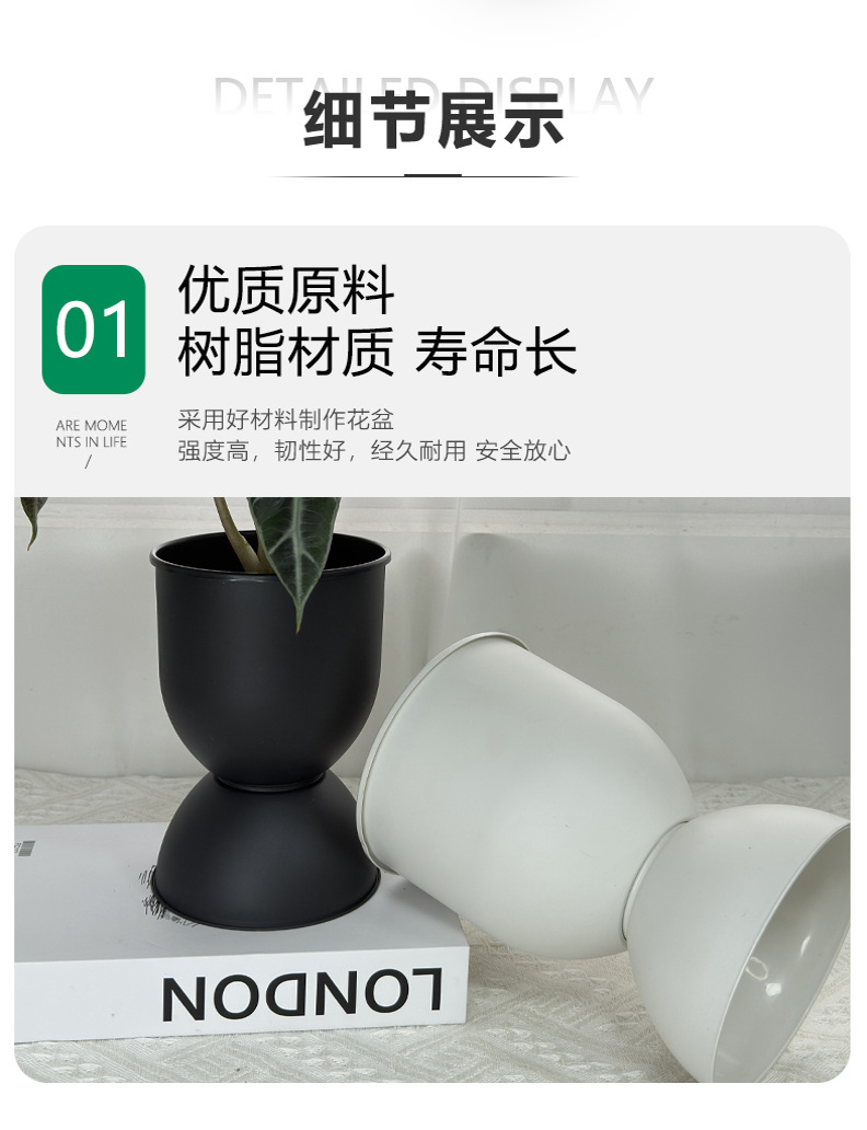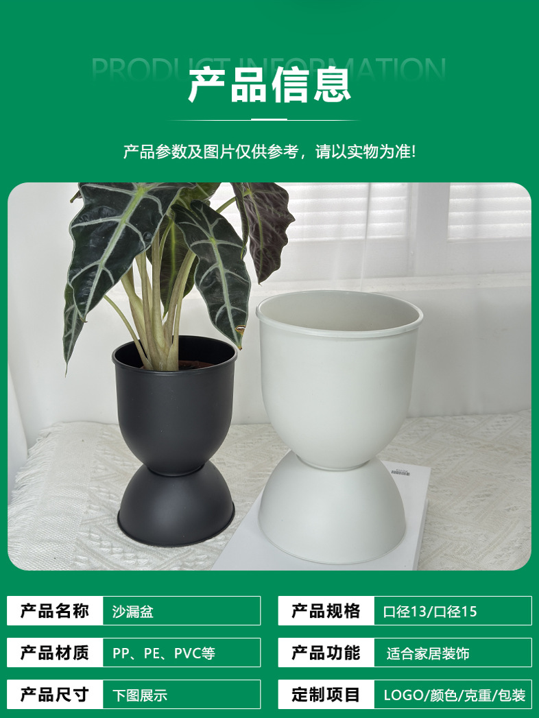 材质: 树脂 特性: 透气,不易变形,可降解,耐腐蚀,自吸水, 类型: 花盆 品牌: 花滋彩 使用形式: 壁挂式,组合式,桌面式,落地式 应用场景: 办公室,酒店,家居摆设,商场,绿化工程, 工艺: 注塑 是否进口: 否 风格: 简约 货号: 沙漏盆 底径: 无 制作方法: 注塑 颜色: 白色,黑色 尺寸: 小号13.3*19.3,大号15*20 是否跨境出口专供货源: 否 是否属于礼品: 否 重量: 0.305 kg/个
