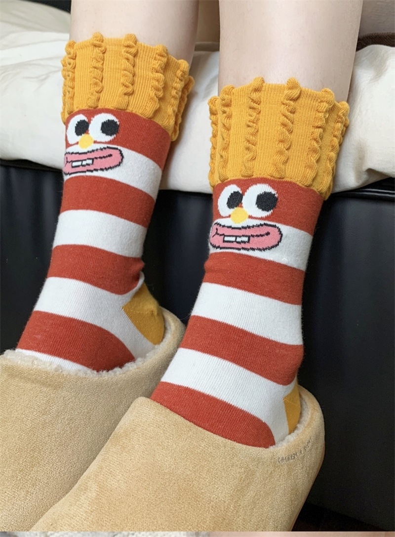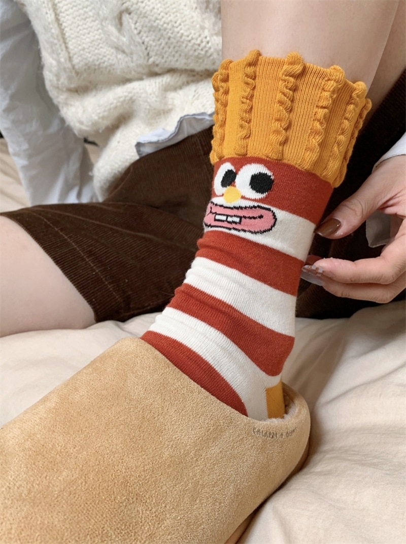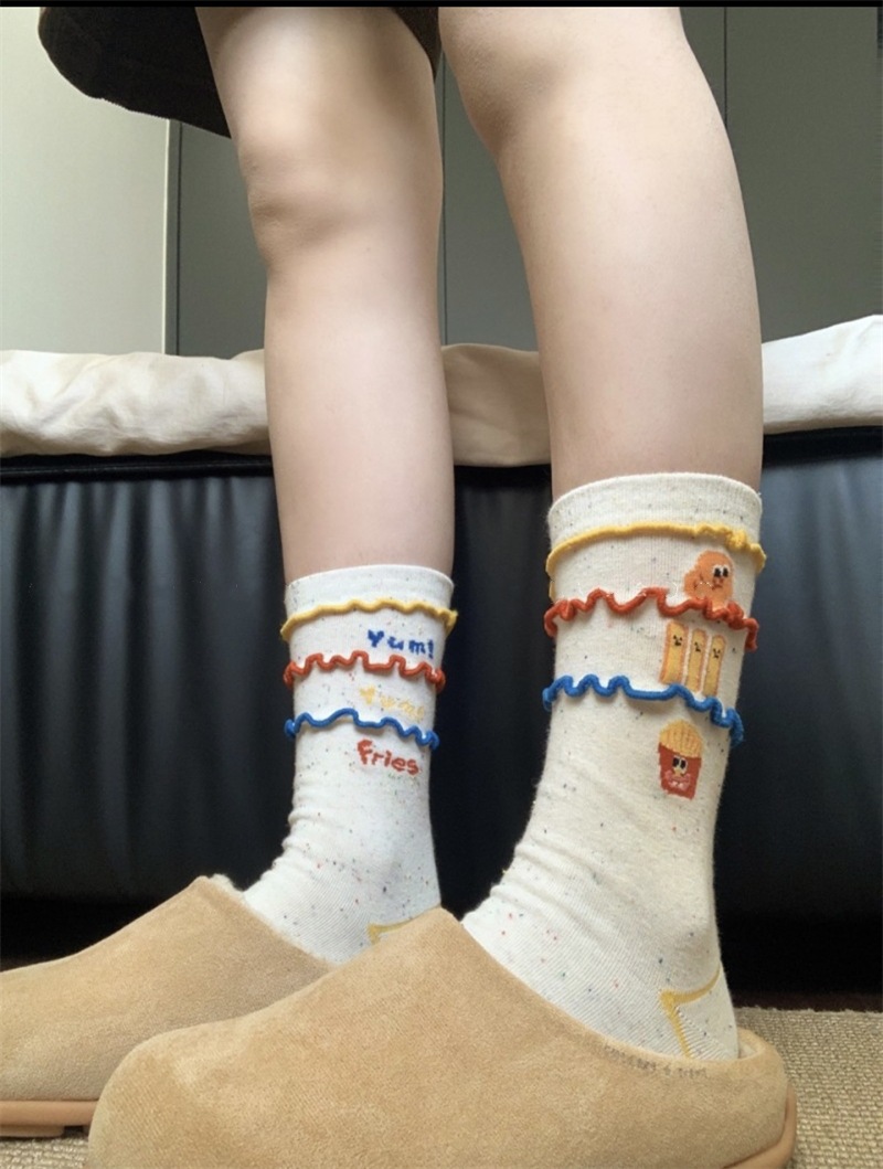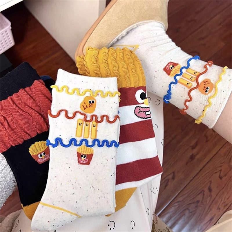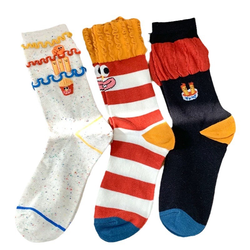 韩国东大门汉堡薯条中筒袜子女搞怪可爱条纹卡通涂鸦袜纯棉堆堆袜 English | 投诉