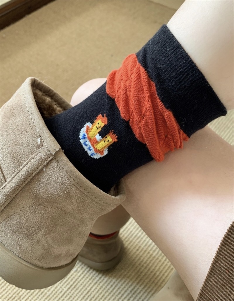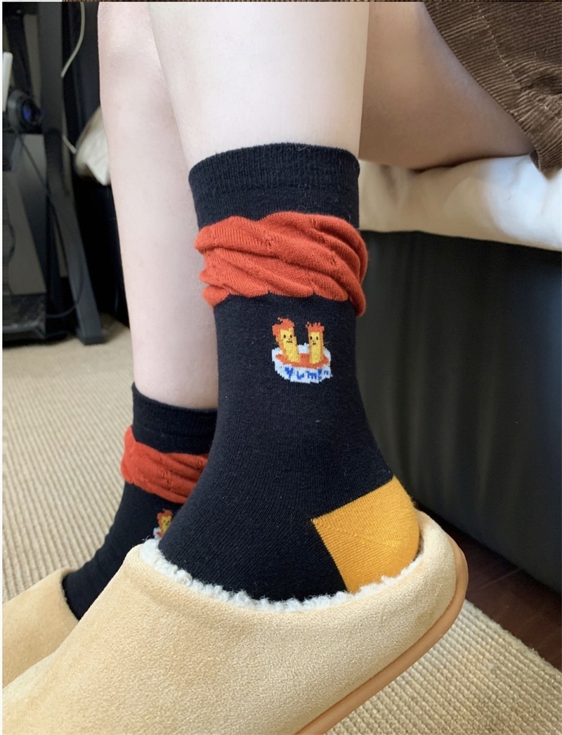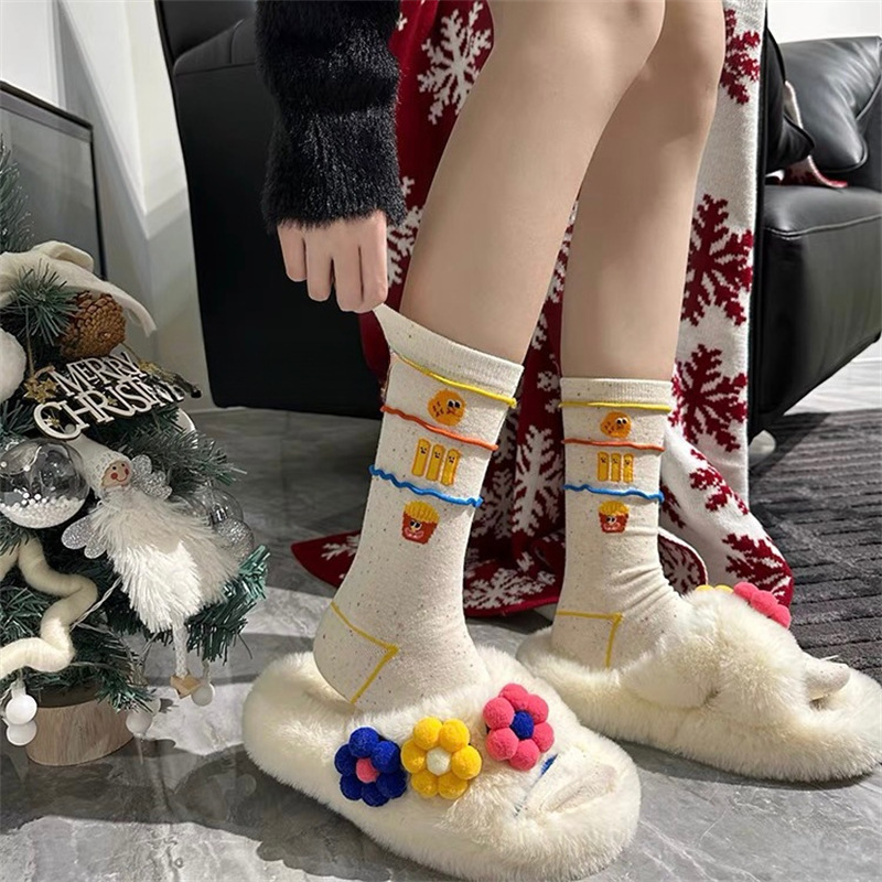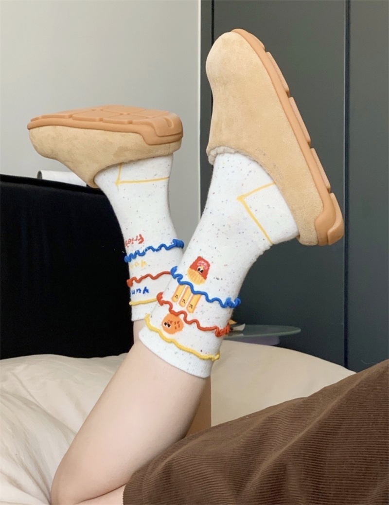 韩国东大门汉堡薯条中筒袜子女搞怪可爱条纹卡通涂鸦袜纯棉堆堆袜 English | 投诉