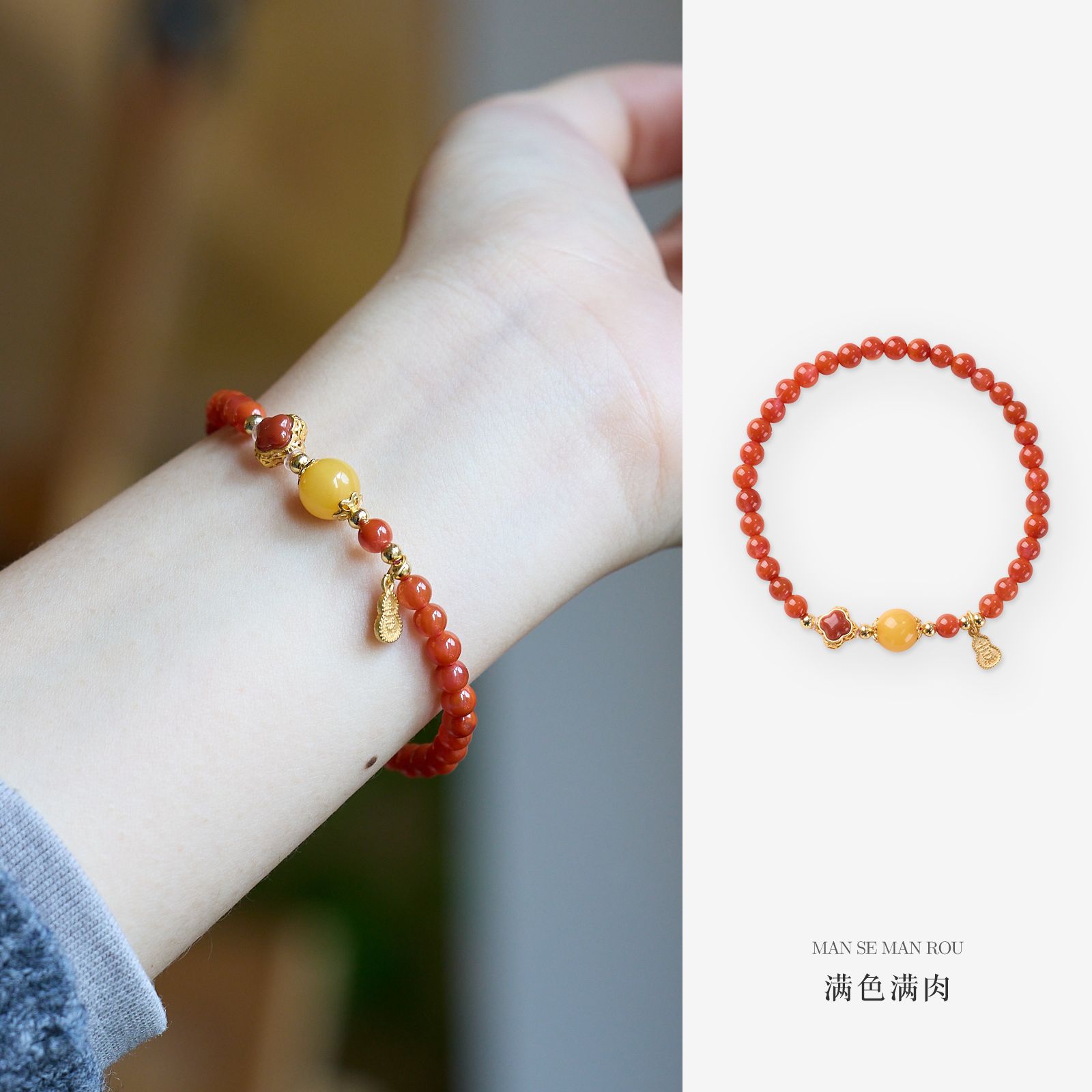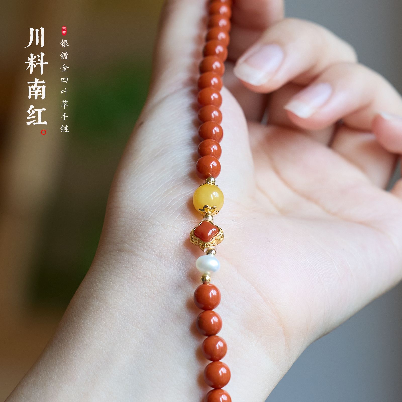 |名称|南红玛瑙 925银镀金镶嵌南红四叶草 天然蜜蜡 吉葫芦 手链