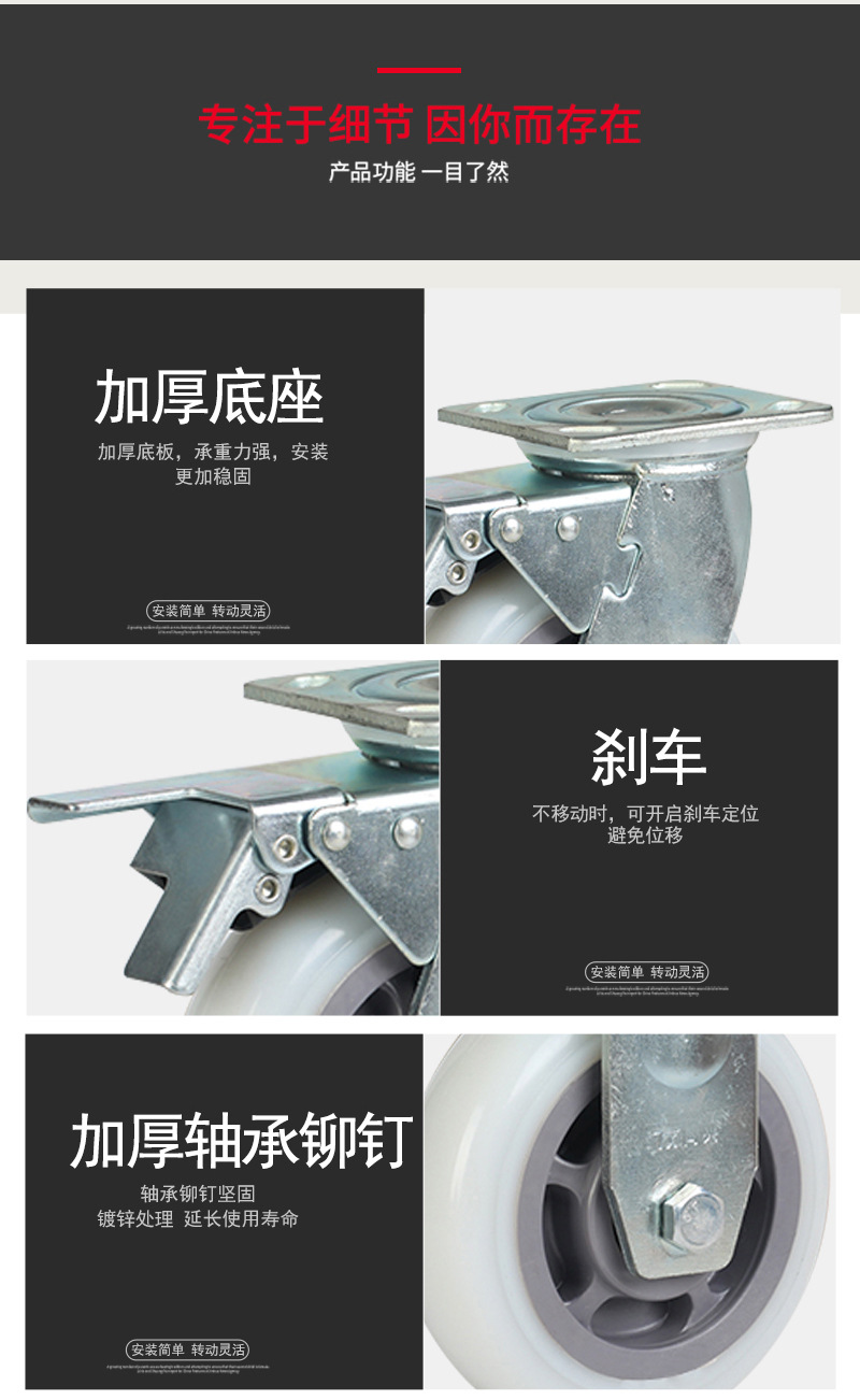 | 5寸平顶侧刹*纯白色*尼龙*140*140mm*万向脚轮*52mm*1.8*双6 | ¥6400 | 10000个可售 |