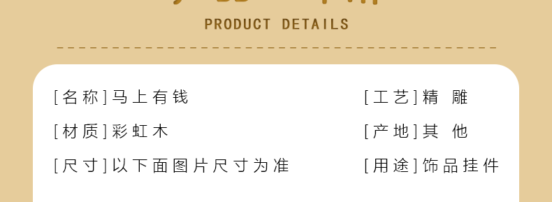 材质: 木 处理工艺: 木雕 品牌: 硕亨 流行元素: 马 款式: 钥匙挂饰 风格: 百搭 上市年份/季节: 2025年秋季 产地: 莆田 货号: ZY2651278 颜色: 彩虹木马上有钱【钥匙扣】 是否跨境出口专供货源: 否 有可授权的自有品牌: 是 图案: 吉祥图案 风格分类: 时尚通勤 流行元素分类: 动物 重量: 0.5 kg/件