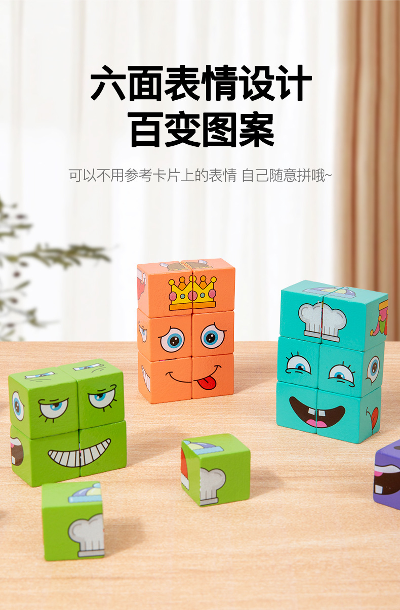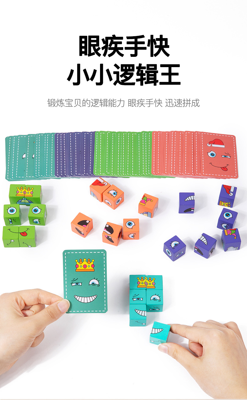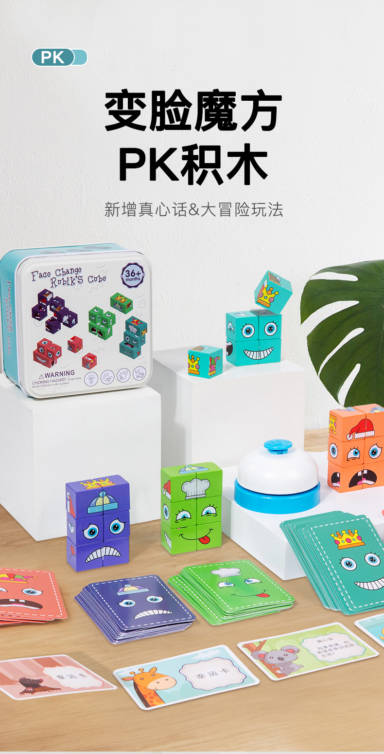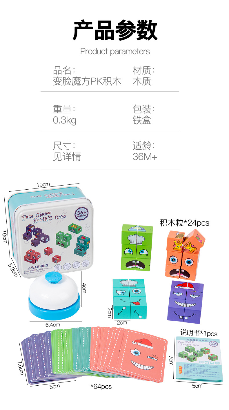 英文铁盒包装 积木24颗、卡片64张 产品名称 新款铁盒变脸魔方