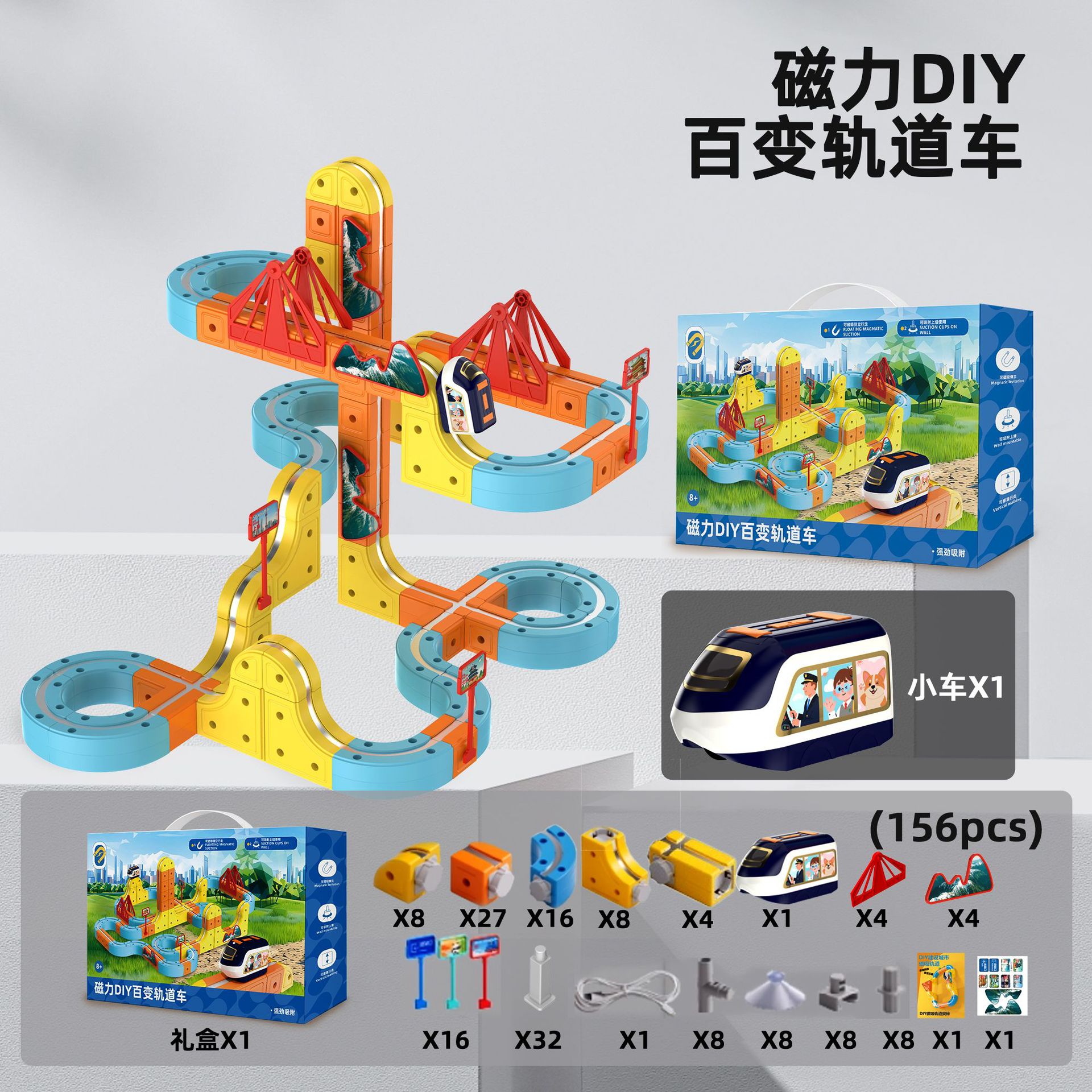 156pcs 磁力DIY百变轨道车 彩盒尺寸:25.8*7.8*43cm 外箱尺寸:54*33.5*89.5cm 16盒/箱 34/32kg
