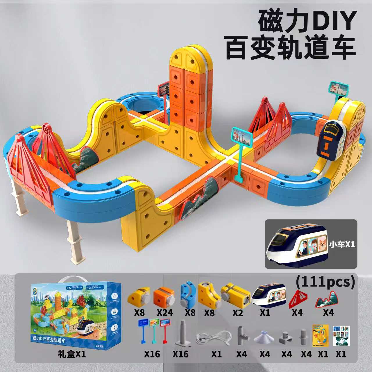 111pcs 磁力DIY百变轨道车 彩盒尺寸:22*7.8*39cm 外箱尺寸:54*33.5*89.5cm 16盒/箱 30/28kg