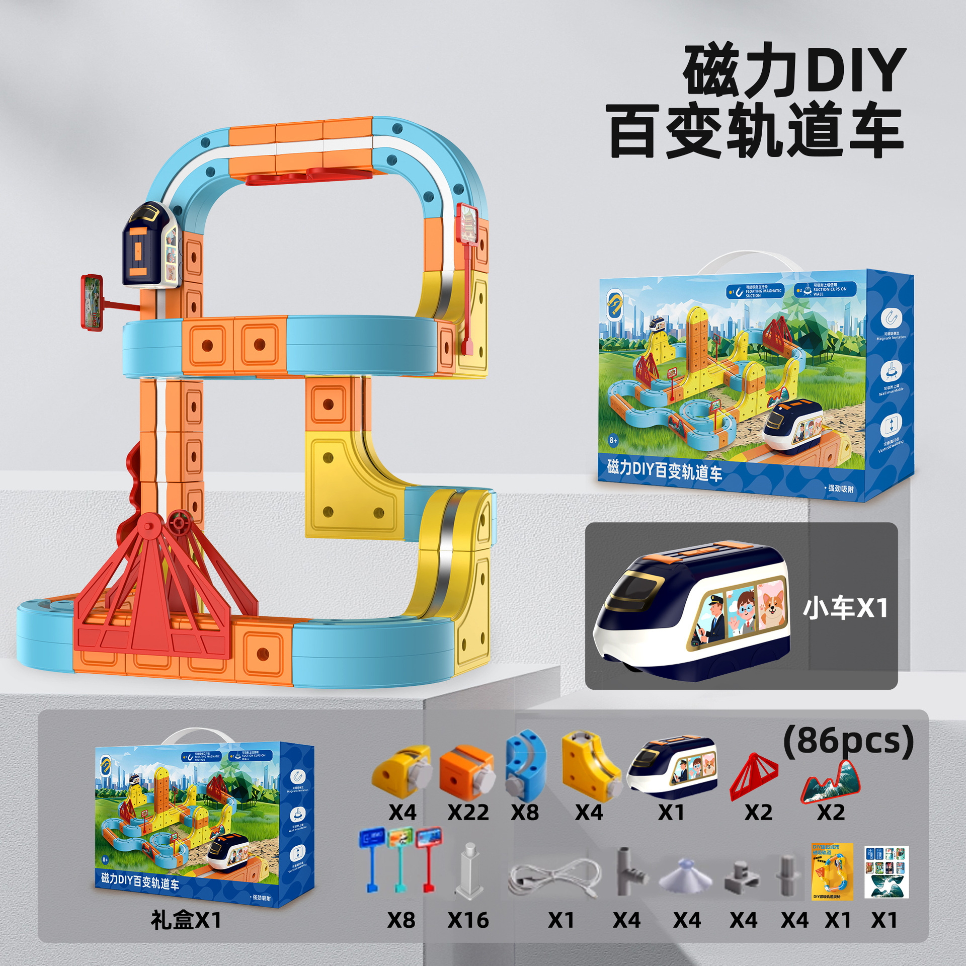 86pcs 磁力DIY百变轨道车 彩盒尺寸:21.8*7.8*30cm 外箱尺寸:65.5*32*69.5cm 24盒/箱 29/27kg