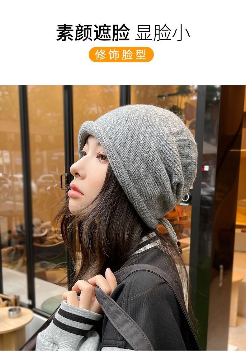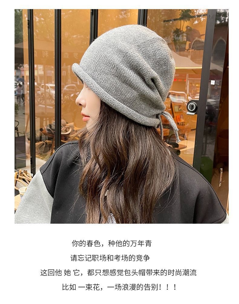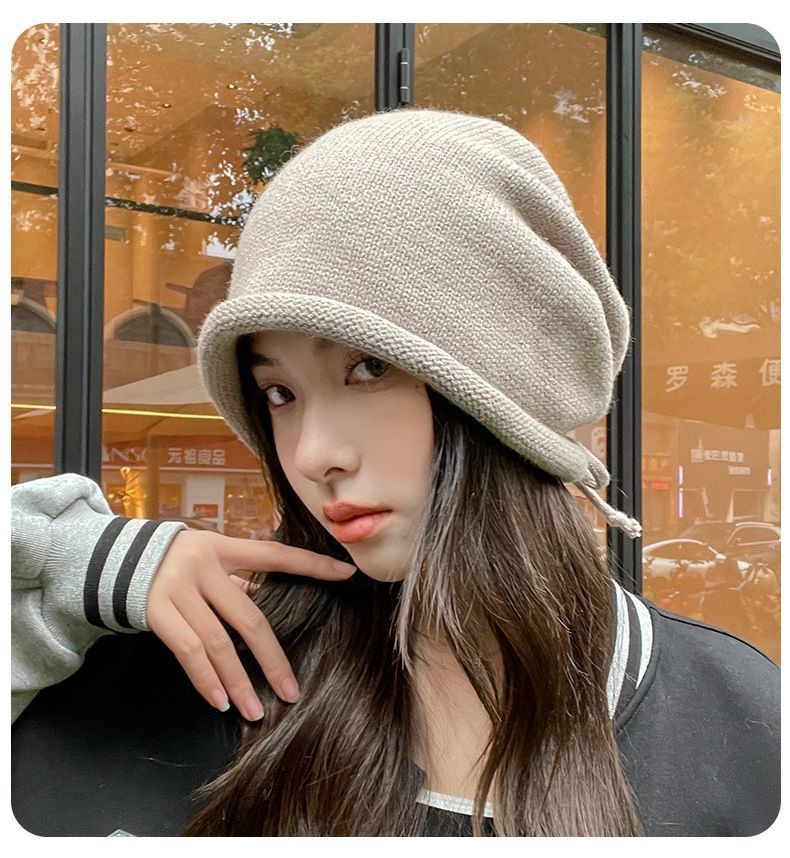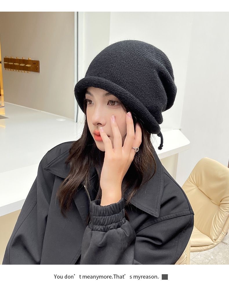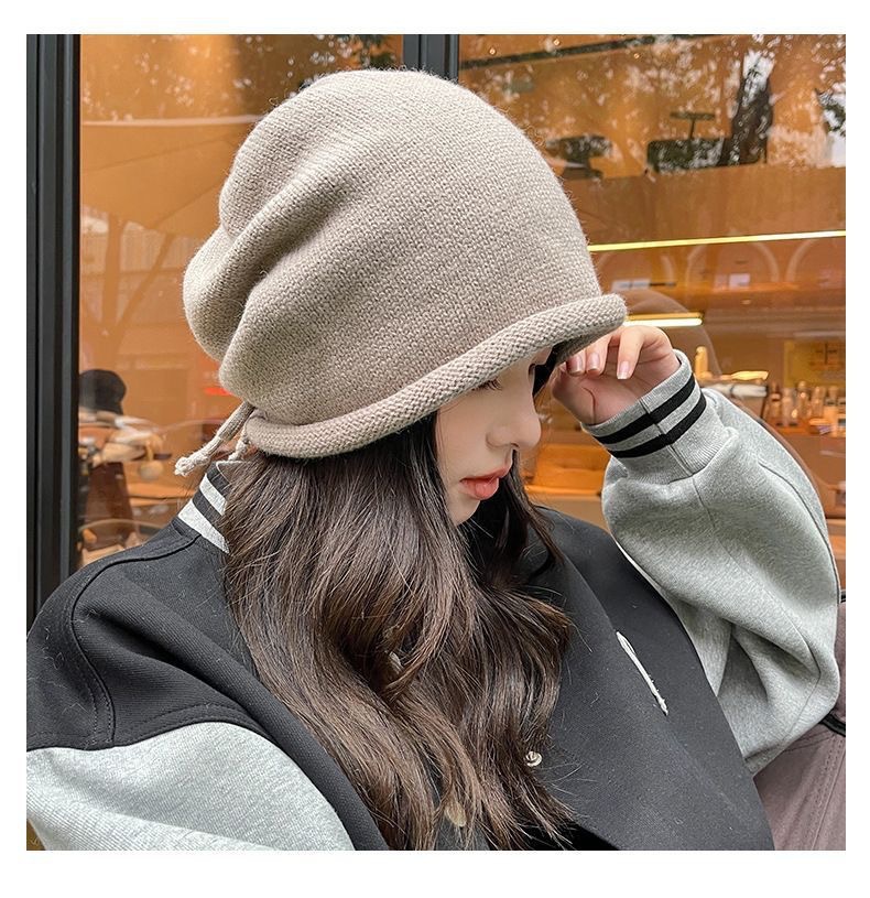 秋冬新款女韩国堆堆大头围护耳抽绳帽子包头帽百搭保暖防寒针织帽