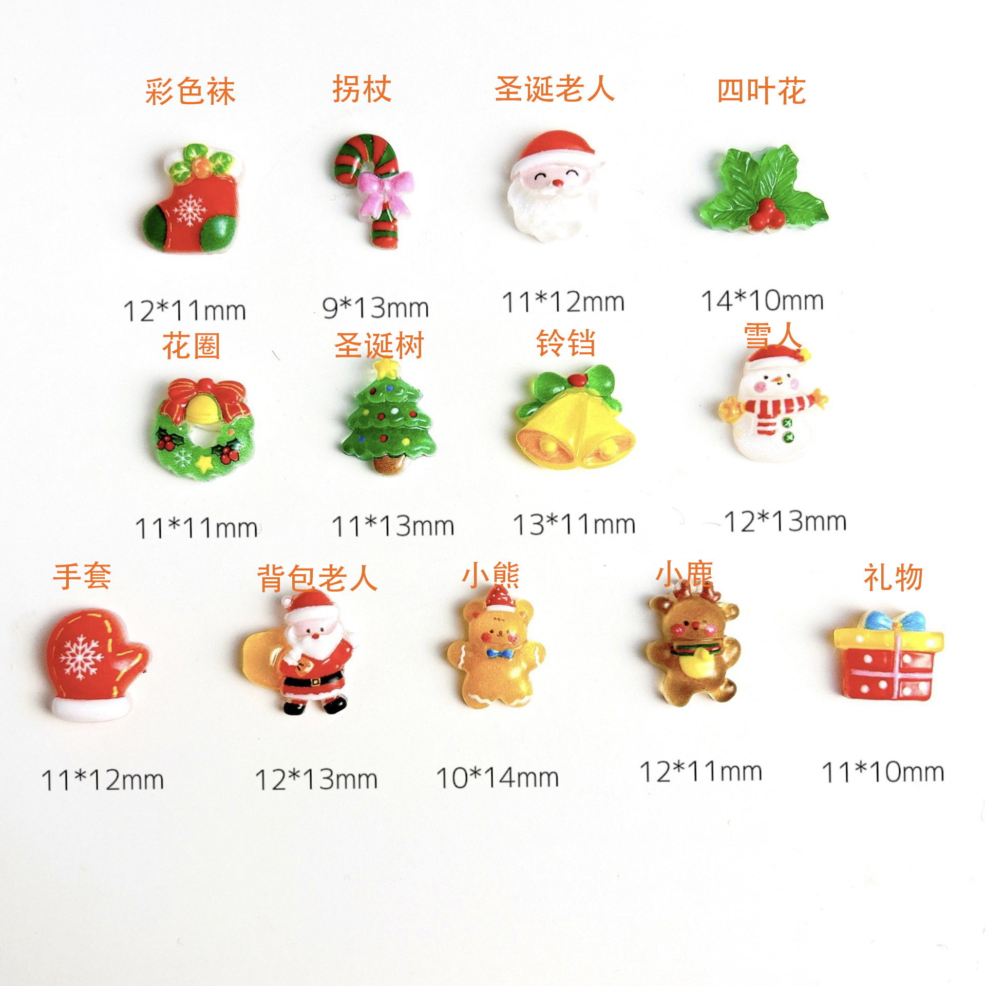 尺寸:12*11mm 圣诞袜 9*13mm 圣诞拐杖 11*12mm 圣诞老人 14*10圣诞四叶花 11*11mm 圣诞花圈 11*13mm圣诞树 圣诞13*11mm 圣诞铃铛 12*13mm圣诞雪人 11*12mm圣诞手套 12*13mm背包老人 10*14mm圣诞小熊 12*11mm 圣诞小鹿 11*10mm圣诞礼物
