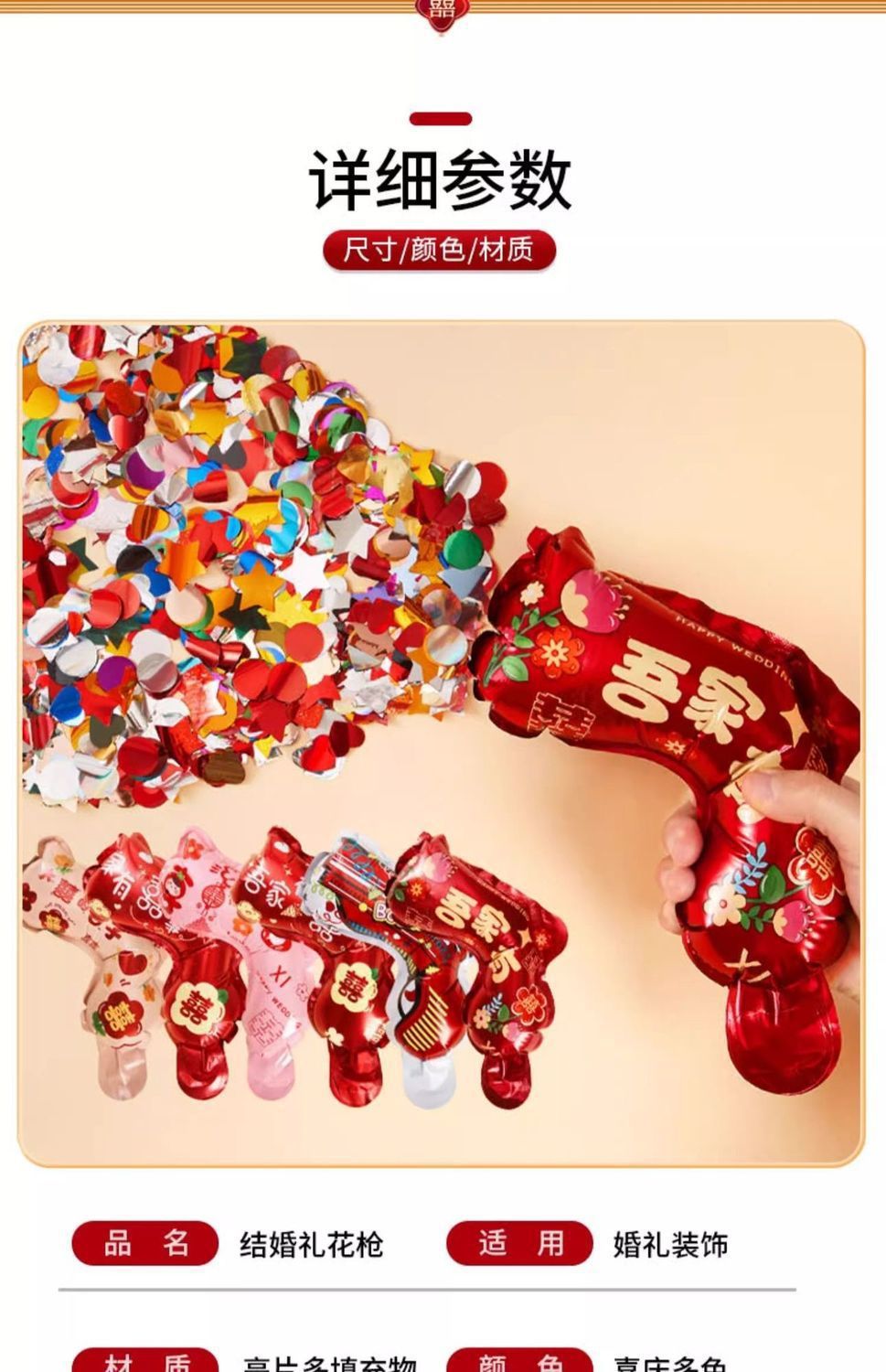 品牌: 其他 尺寸: 30cm 是否IP授权: 否 包装: 见详细 货号: 结婚礼花枪 产品编号: 礼花枪 是否专利货源: 否 是否进口: 否 有可授权的自有品牌: 是 是否跨境出口专供货源: 是 是否属于礼品: 否 图案: 几何 重量: 0.115 kg/个