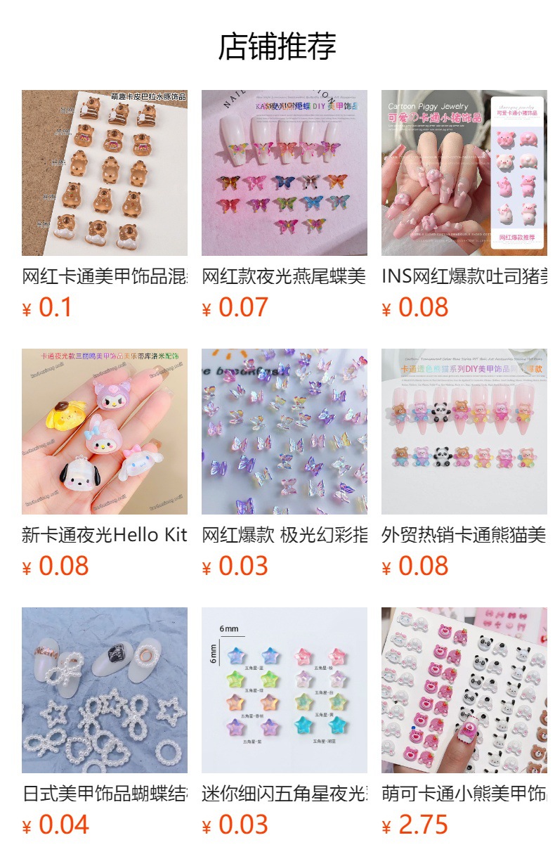 • 本店主营DIY饰品 饰品配件 美甲饰品 树脂配件 美甲钻 位于国际商贸城一区东扩3楼12门3楼3街 4单元103648 欢迎大家进店选购 联系方式13362990628