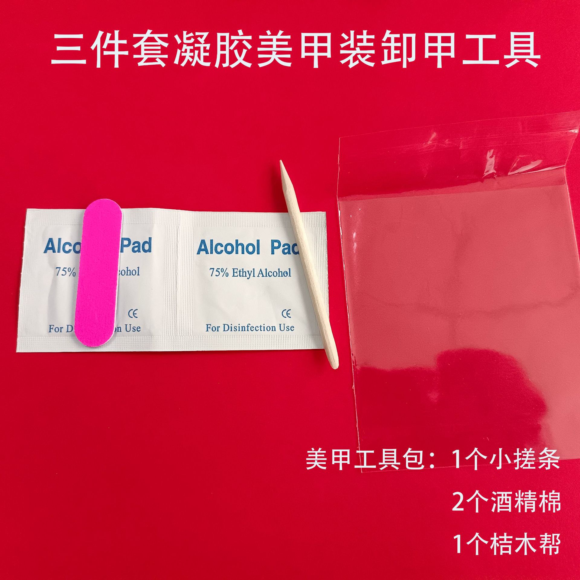 品名:三件套美甲工具套装如图(包含小搓条1个,酒精包2个,桔木棒1个)需要自己手工包装
