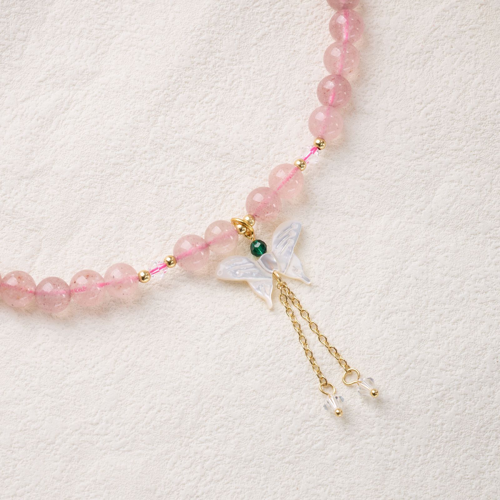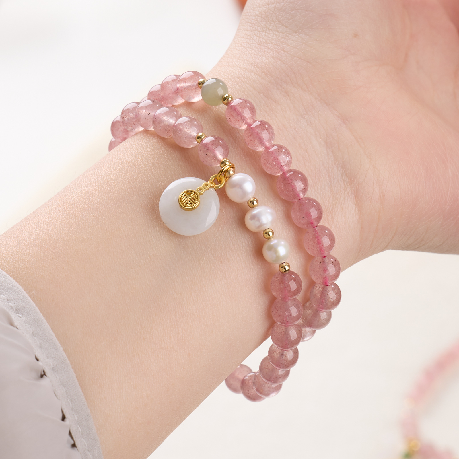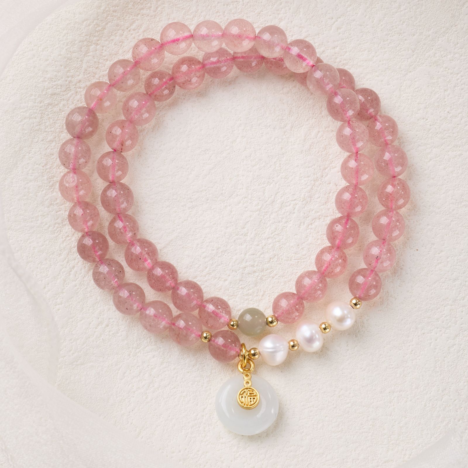 |主材|草莓晶,白蝶贝,南红玛瑙,天山翠,翡翠平安扣,和田玉,淡水珍珠,铜镀金配件