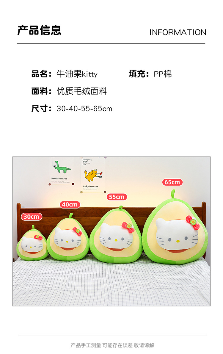 填充材质: PP棉 毛绒分类: 短毛绒 所属分类: 毛绒公仔 造型是否卡通、动漫: 是 包装方式: 网袋 是否多功能: 否 货号: 牛油果KT猫