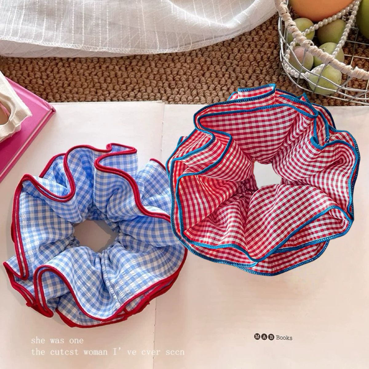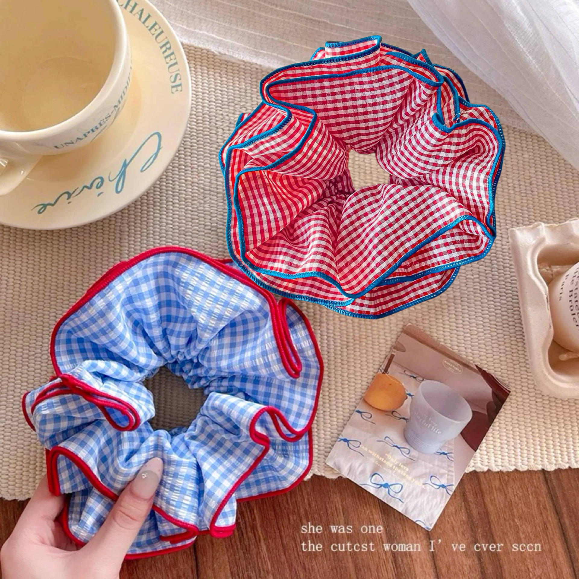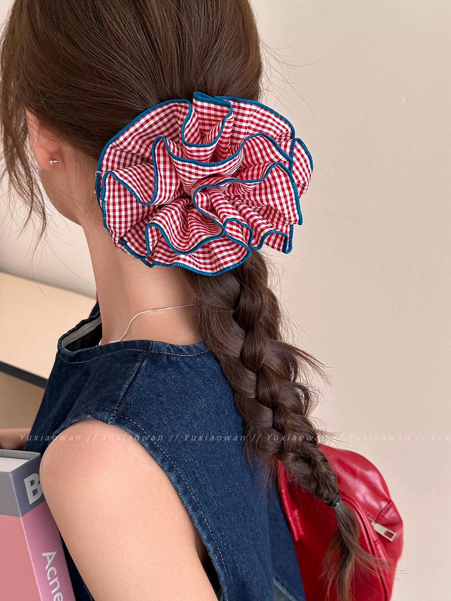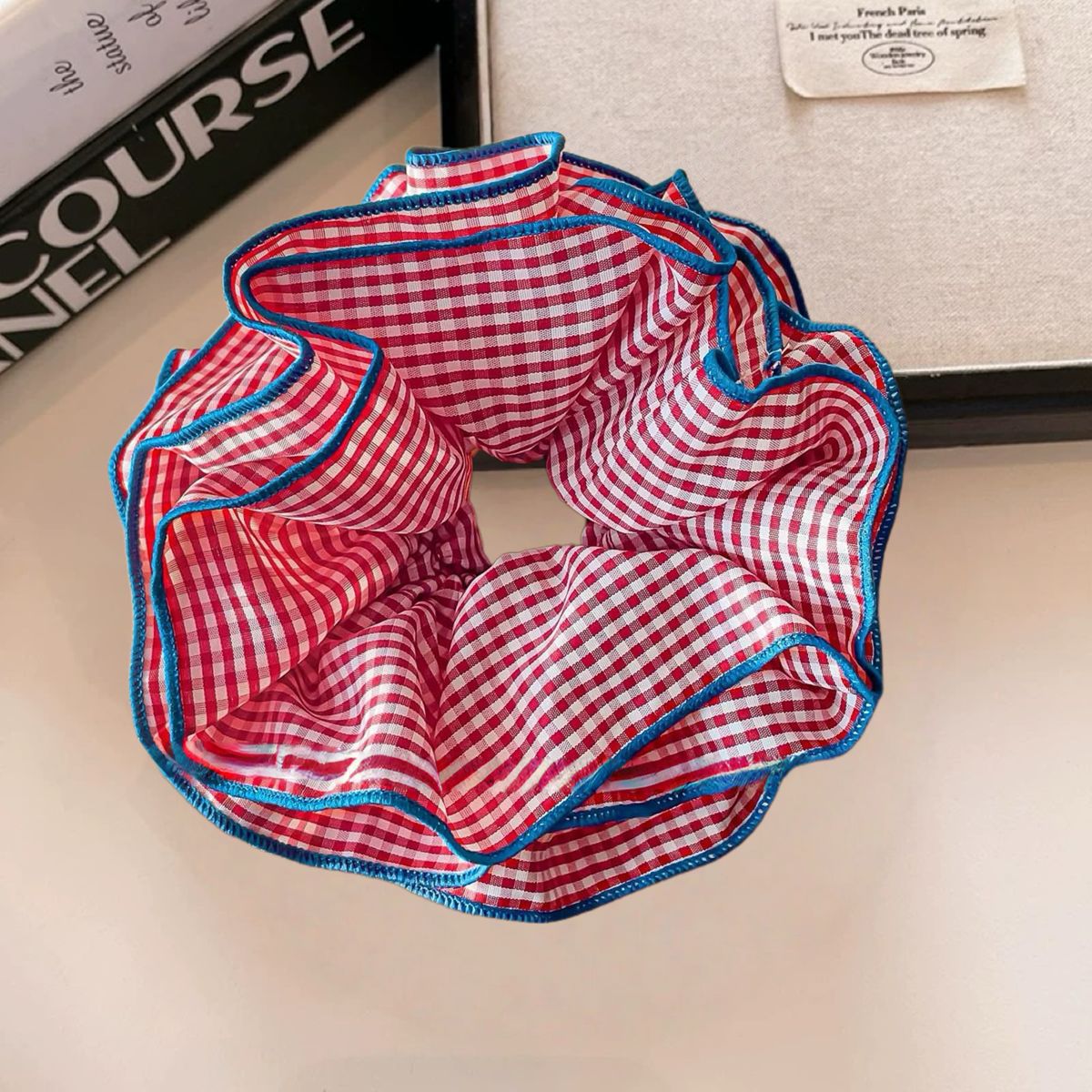 超大号韩系复古蓝色格子大肠发圈女高级感重工头绳扎头发超大发饰 English | 投诉