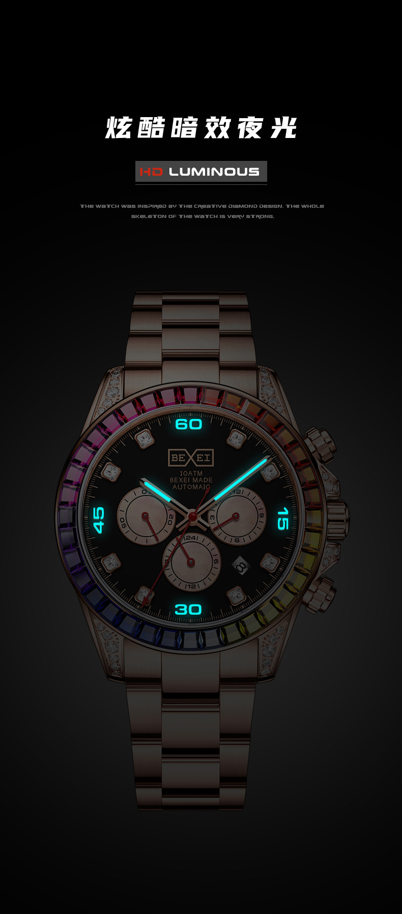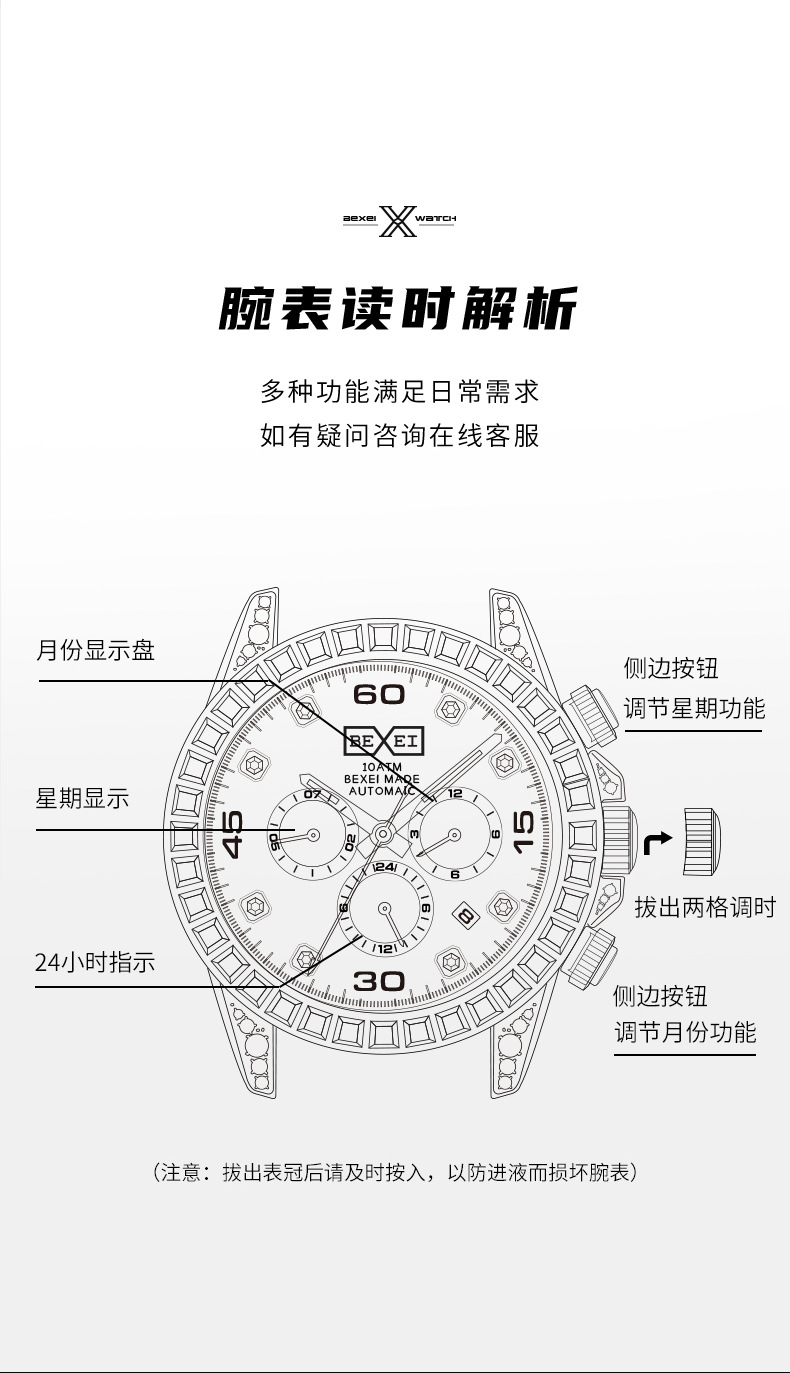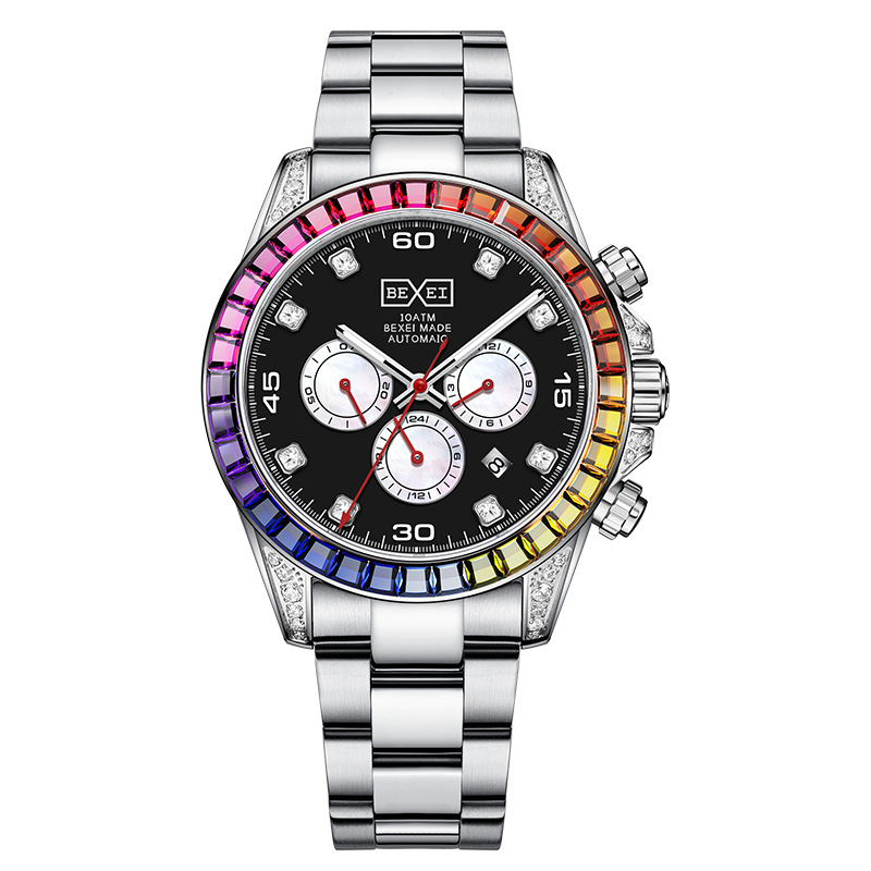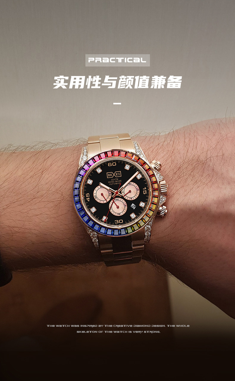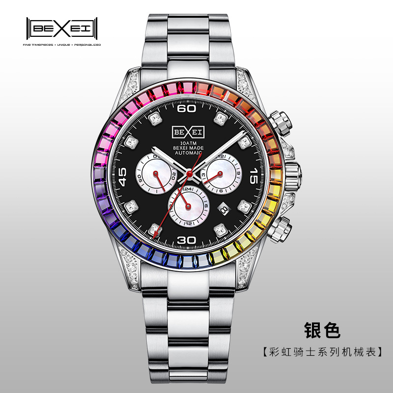 BEXEI/彼赛原装正品手表彩红骑过钻圈机械表男三眼六针多功能腕表 English | 投诉