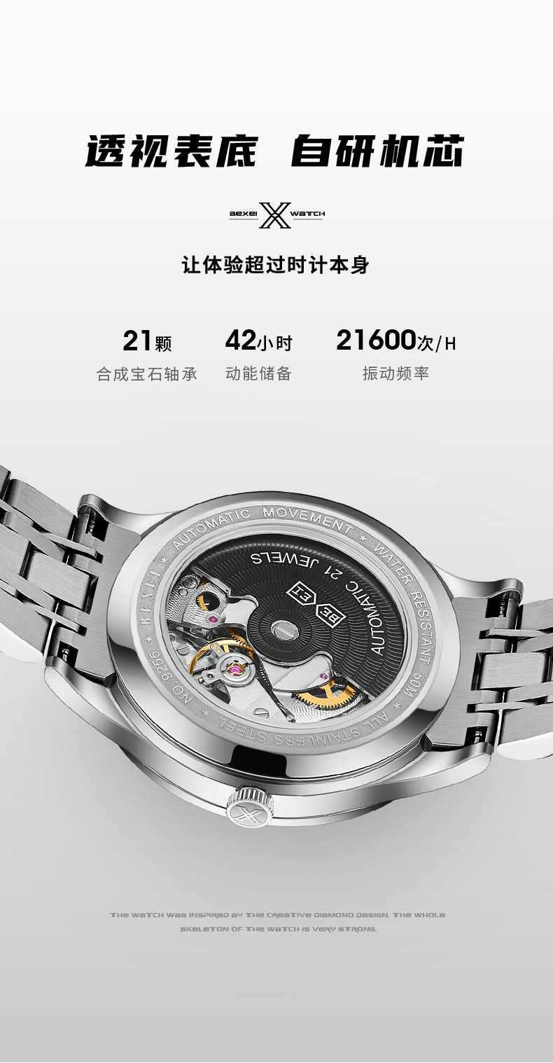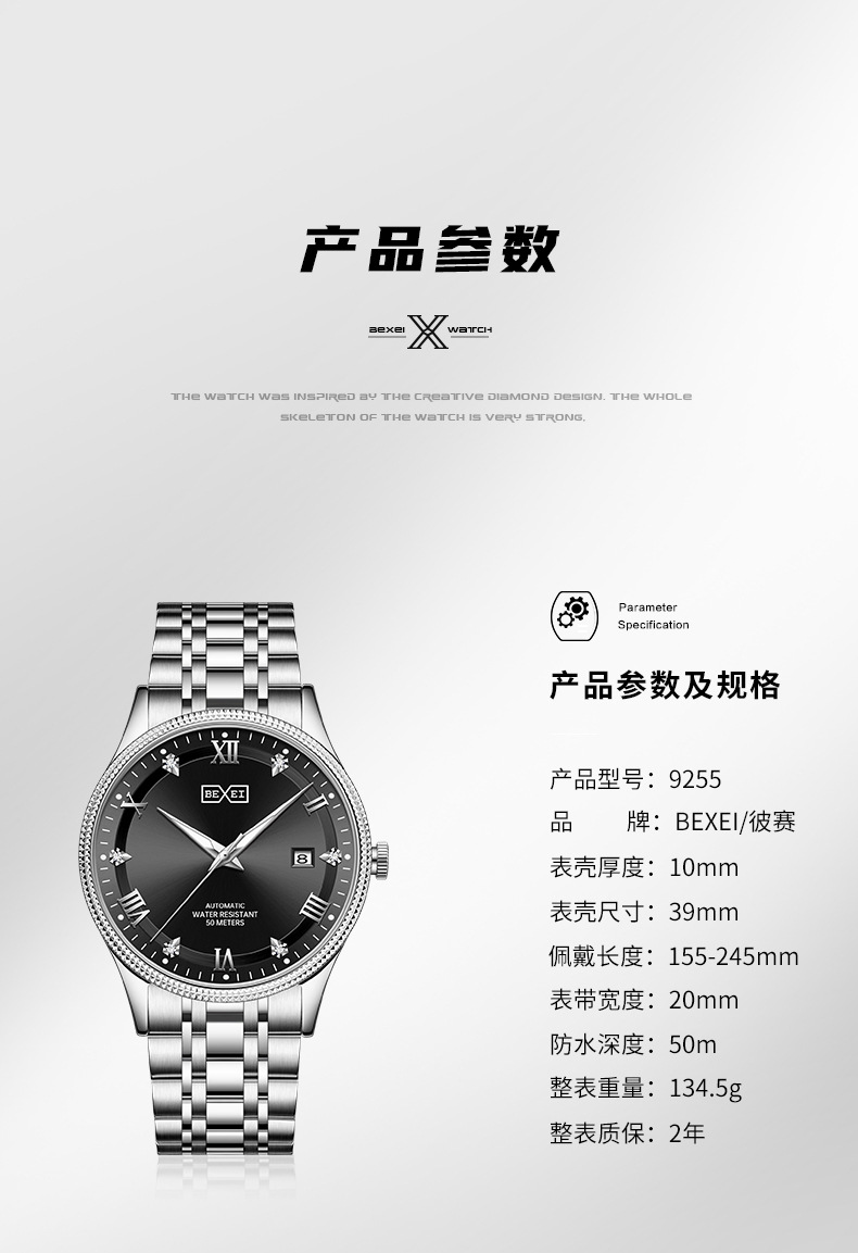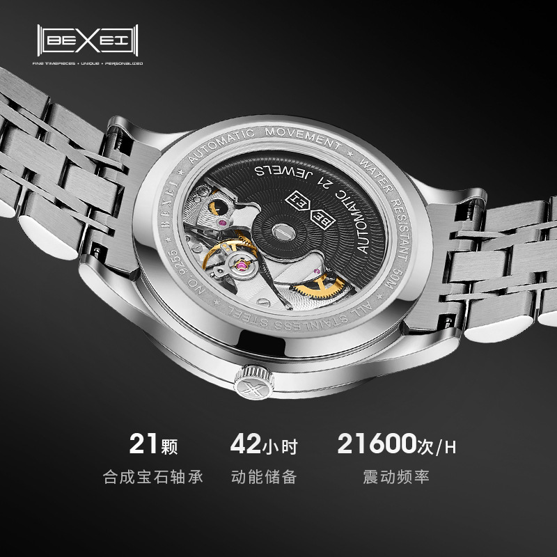 品牌: BEXEI 表带材质: 精钢 表壳材质: 精钢 特殊功能: 夜光,日历 机芯品牌: 原装机械 机芯种类: 机械 镜面材质: 蓝宝石水晶玻璃镜面 表扣材质: 不锈钢 是否进口: 否 型号: 9255 加工定制: 否 加印LOGO: 不可以 显示类型: 指针 适用人群: 男士 风格: 简约 是否专利货源: 否 防水: 可以 防水性能: 50m 机芯产地: 原装机芯 表盘直径: 39mm