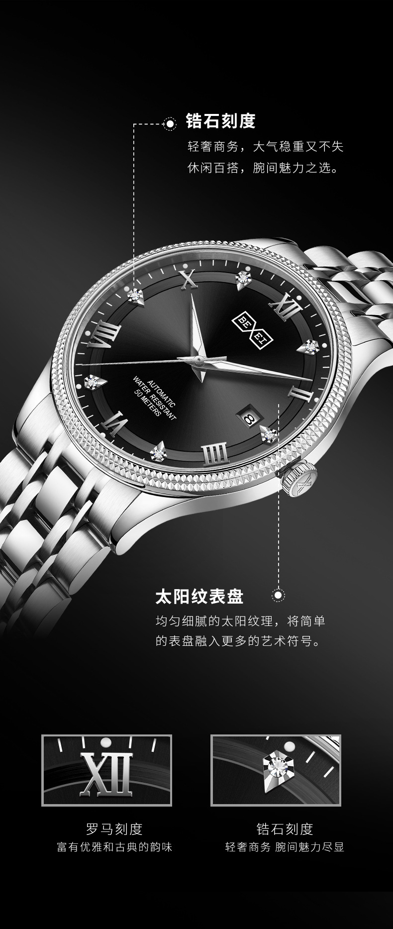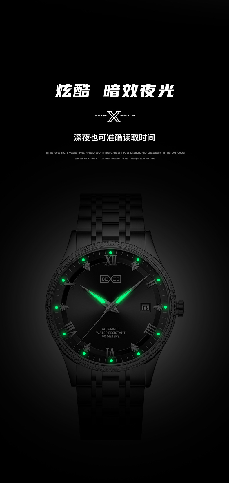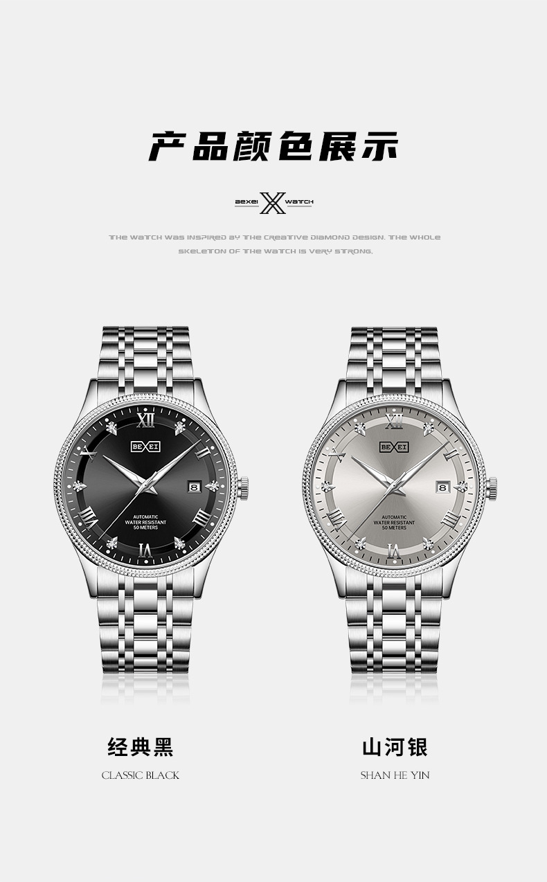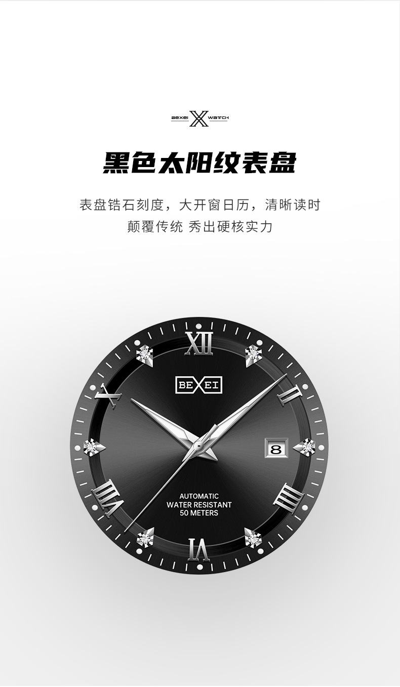 BEXEI/彼赛男表名匠系列罗马刻度日历夜光防水全自动男士机械腕表 English | 投诉