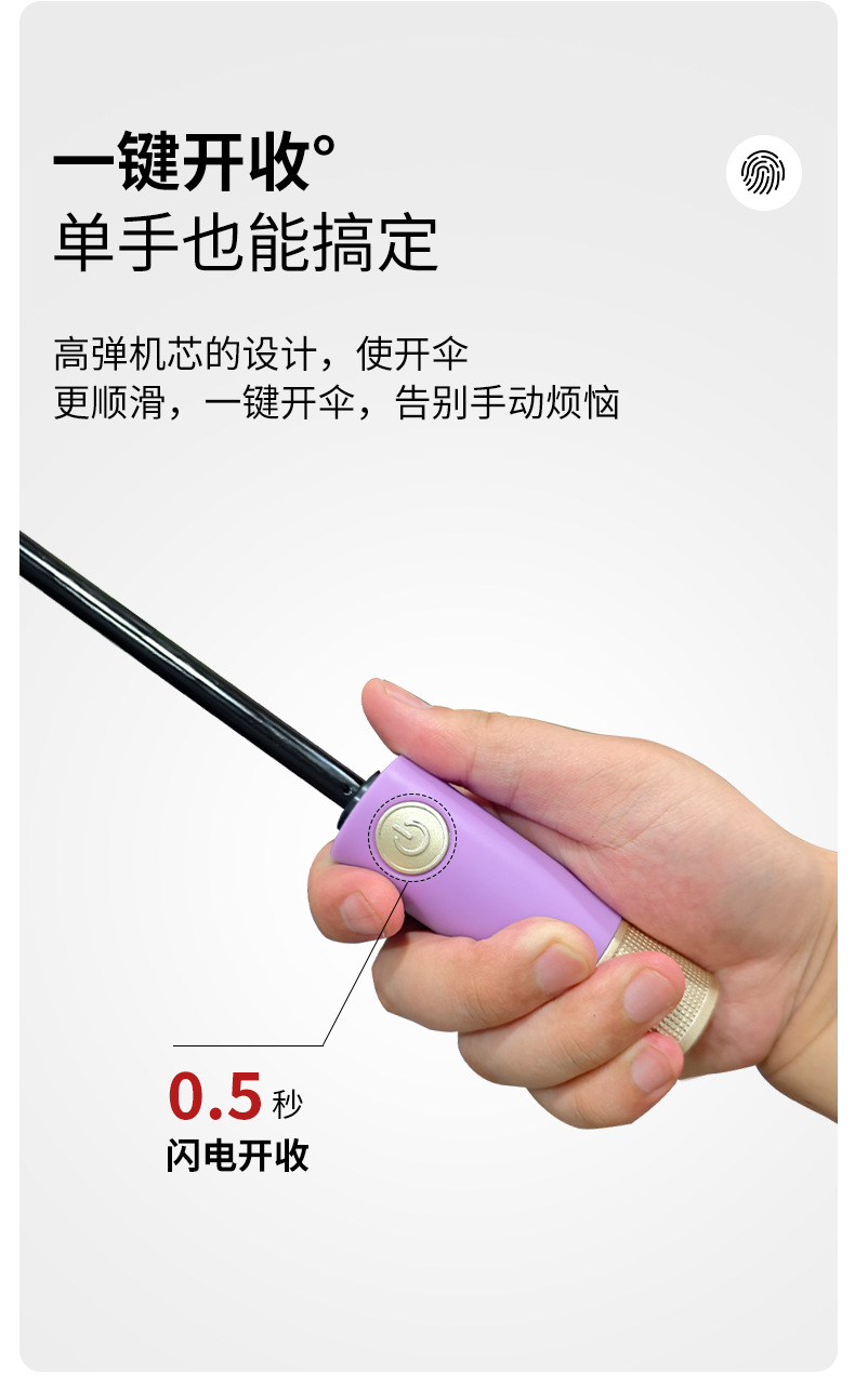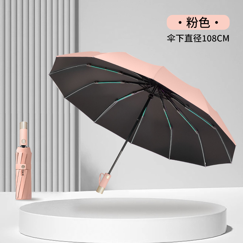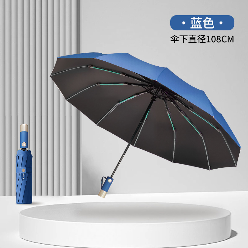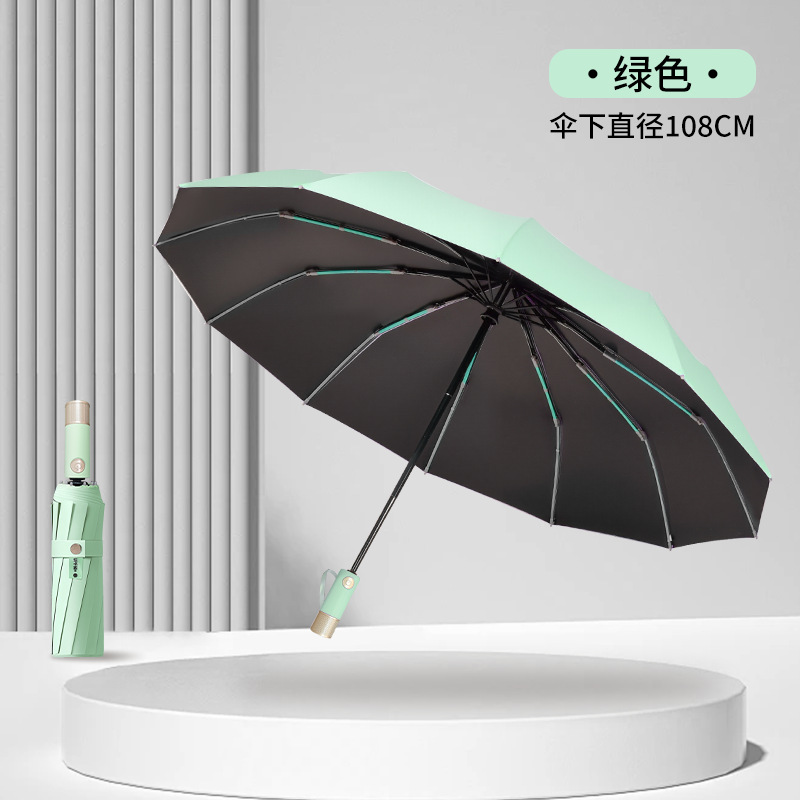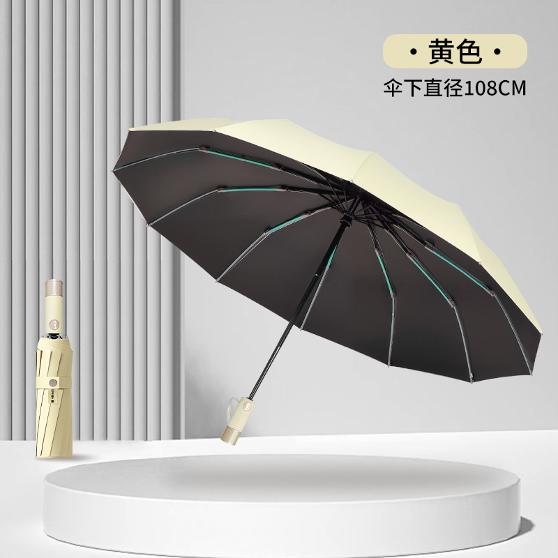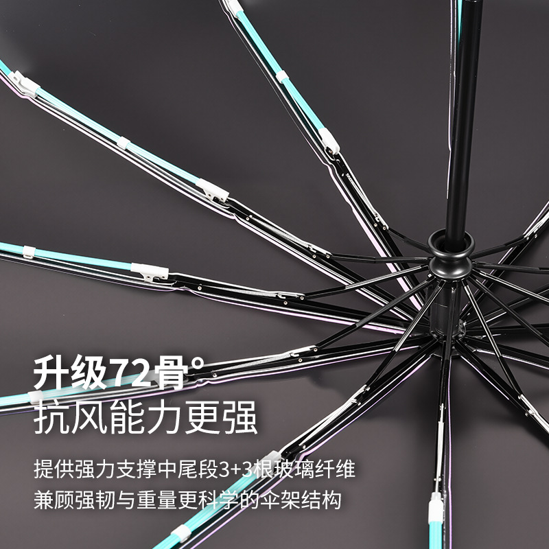伞骨数量: 12骨 款式: 三折伞 伞布材质: 黑胶 伞骨材质: 钢 伞布过胶: 黑胶 中棒材质: 铁 收伞方式: 自动 风格: 创意潮流 重量: 0.474 kg/个
