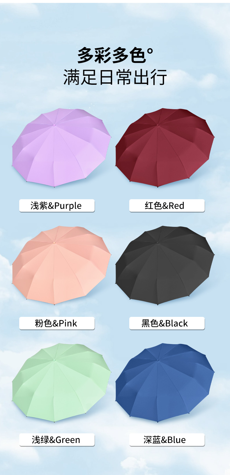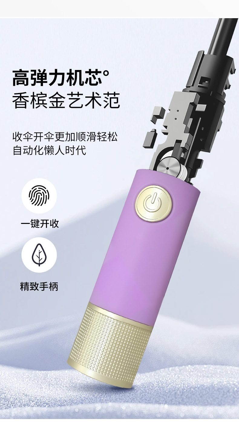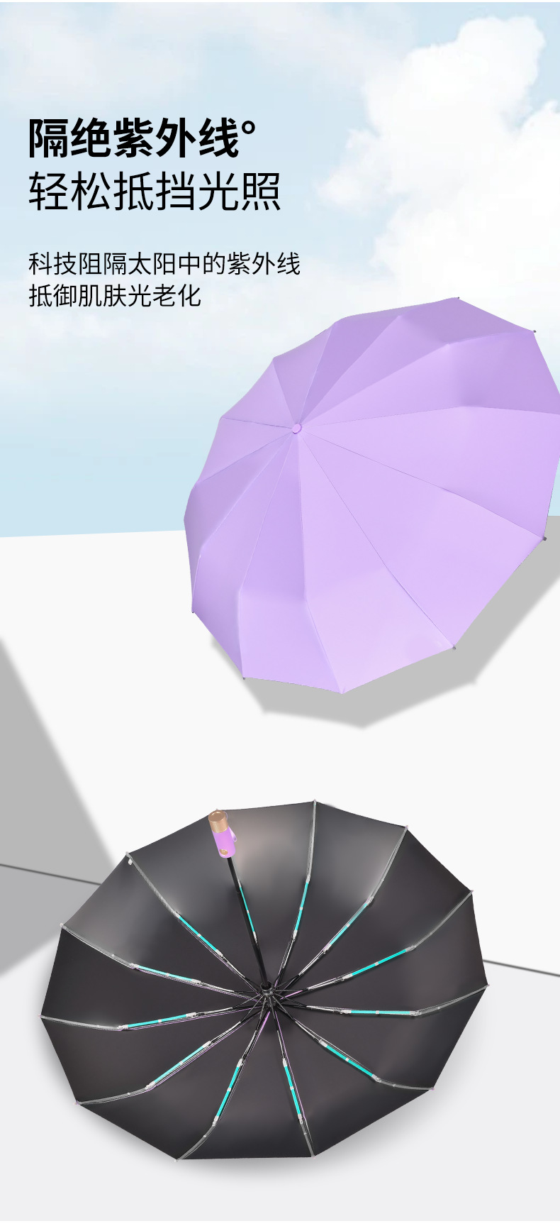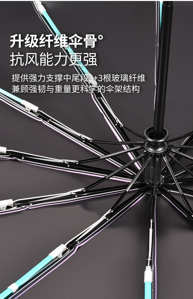 伞骨数量: 12骨 款式: 三折伞 伞布材质: 黑胶 伞骨材质: 钢 伞布过胶: 黑胶 中棒材质: 铁 收伞方式: 自动 风格: 创意潮流 重量: 0.474 kg/个