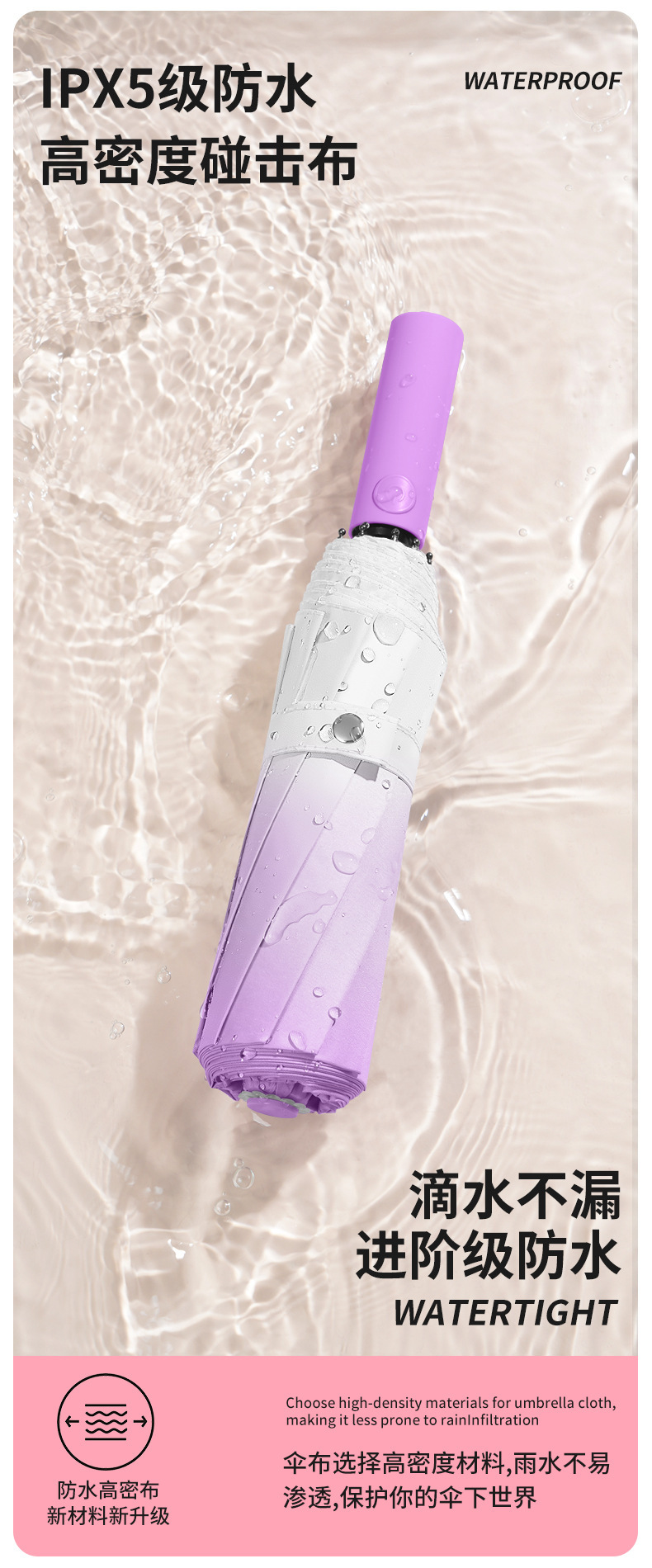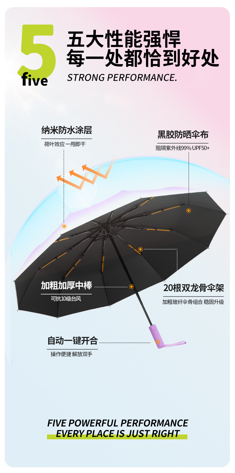 伞骨数量: 10骨 款式: 三折伞 伞布材质: 黑胶 伞骨材质: 纤维 伞布过胶: 黑胶 中棒材质: 铁 收伞方式: 自动 风格: 现代简约 重量: 0.424 kg/个