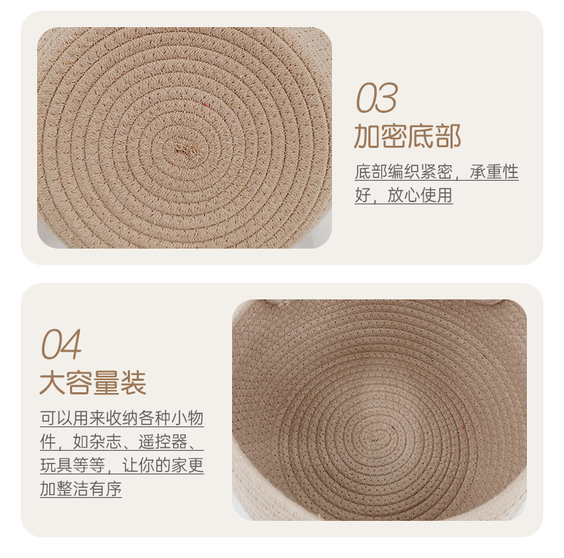 材质: 棉绳 品牌: 其他 产品类别: 收纳筐 适用范围: 化妆用品/首饰,书籍杂志,耳机线/电线 风格: 现代简约风 是否进口: 否 型号: / 产地: 山东 箱装数量: / 产品上市时间: 2025 专利: 否 价格段: 5-10元 贸易属性: 内贸+外贸 货号: 53 颜色: 灰色,米色 规格: D20*15CM 鼓肚25CM 是否跨境出口专供货源: 否 重量: 5.0 kg/件