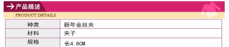 材质: 钛钢 品牌: 无 发夹分类: 鸭嘴夹 流行元素: 喜庆 风格: 中国风 处理工艺: 手工 货号: S0010 样式: 无 产地: 金华 主要下游平台: 淘宝,京东,PDD,快手,SHEIN,速 颜色: 鸭嘴夹 有可授权的自有品牌: 否 是否跨境出口专供货源: 否 上市年份/季节: 2025年春季 风格分类: 文艺复古 适用人群: 儿童 流行元素分类: 民族/国风 重量: 0.01 kg/个
