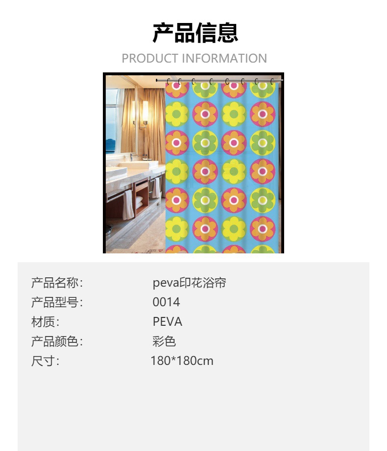 材质: peva 品牌: 嘉冠2 风格: 现代简约 是否进口: 否 产地: 浙江 加印LOGO: 可以 图案: 清爽 贸易属性: 一般贸易 加工定制: 可以 货号: 0014 颜色: 款式一,款式二,款式三,款式四,款式五 规格: 尺寸:180*180 主要下游平台: 亚马逊,wish,LAZADA 主要销售地区: 欧洲,东南亚,中东,其他 有可授权的自有品牌: 否 是否跨境出口专供货源: 是 是否有专利: 否 版权: 无 重量: 0.19 kg/个