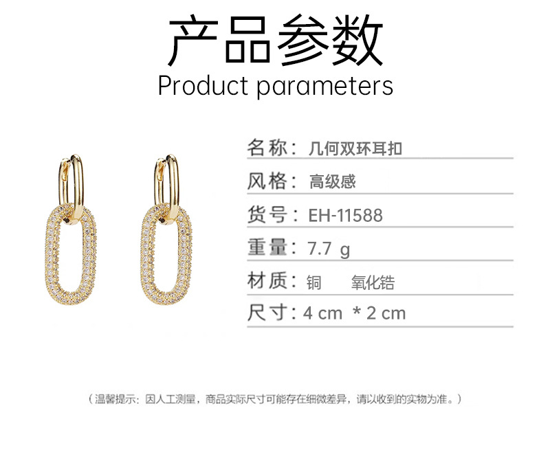 材质: 锆石 处理工艺: 微镶 流行元素: 椭圆 风格: 高级感 货号: EH-11588 造型: 几何型 产地: 义乌 主要下游平台: 淘宝,亚马逊,快手,天猫,抖音 颜色: 金色,银色 是否跨境出口专供货源: 是 上市年份/季节: 2023年夏季 风格分类: 时尚通勤 主要销售地区: 欧洲,南美,东南亚,北美,东北亚,中东 适用人群: 女式 流行元素分类: 几何 重量: 0.2 kg/对