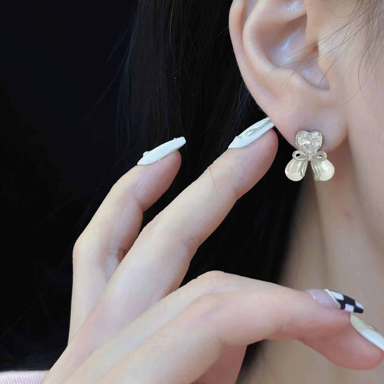 爱心蝴蝶结微镶锆石珍珠耳钉女小众精致轻奢设计感简约小巧耳饰