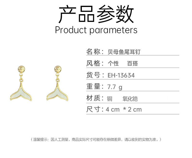 材质: 贝壳 处理工艺: 电镀 流行元素: 鱼尾 风格: 百搭 造型: 其他 货号: EH-13634 产地: 义乌 主要下游平台: 淘宝,亚马逊,快手,天猫,抖音 颜色: 金色,银色 是否跨境出口专供货源: 是 上市年份/季节: 2024年夏季 风格分类: 时尚通勤 主要销售地区: 欧洲,南美,东南亚,北美,东北亚,中东 适用人群: 女式 流行元素分类: 形状/图案 重量: 0.05 kg/对