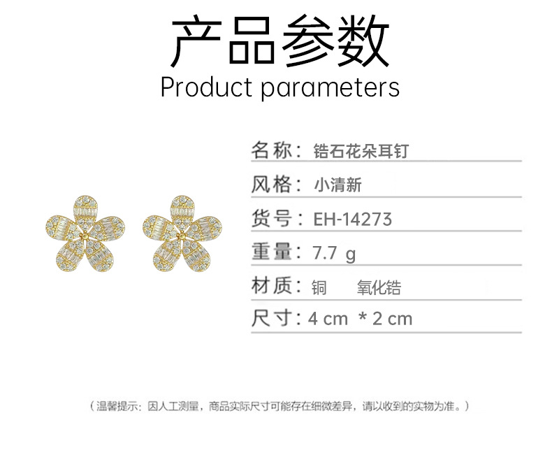 材质: 锆石 处理工艺: 电镀 流行元素: 花朵 风格: 小清新 造型: 花卉 货号: EH-14273 产地: 义乌 主要下游平台: 淘宝,亚马逊,快手,天猫,抖音 颜色: 金色,银色 是否跨境出口专供货源: 是 上市年份/季节: 2024年春季 风格分类: 清新甜美 主要销售地区: 欧洲,南美,东南亚,北美,东北亚,中东 适用人群: 女式 流行元素分类: 植物花卉 重量: 0.05 kg/对
