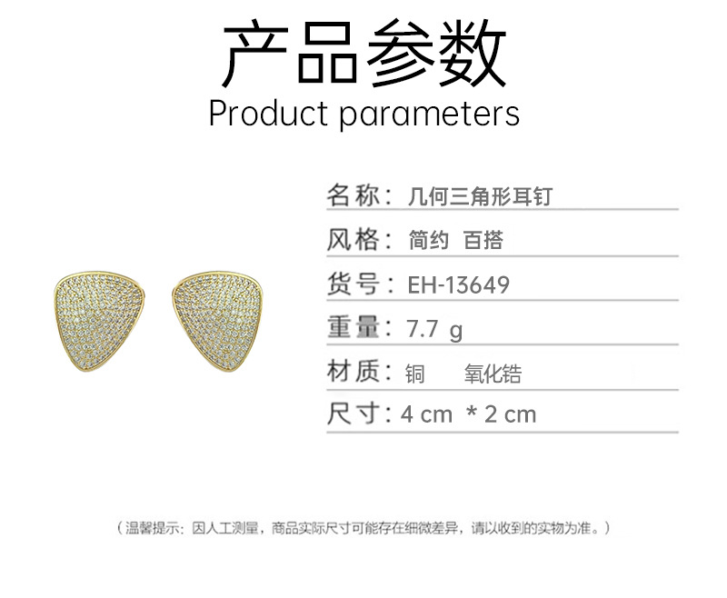 材质: 锆石 处理工艺: 微镶 流行元素: 三角形 风格: 百搭 造型: 几何型 货号: EH-13649 产地: 义乌 主要下游平台: 淘宝,亚马逊,快手,天猫,抖音 颜色: 金色,银色 是否跨境出口专供货源: 是 上市年份/季节: 2023年冬季 风格分类: 时尚通勤 主要销售地区: 欧洲,南美,东南亚,北美,东北亚,中东 适用人群: 女式 流行元素分类: 几何 重量: 0.05 kg/对