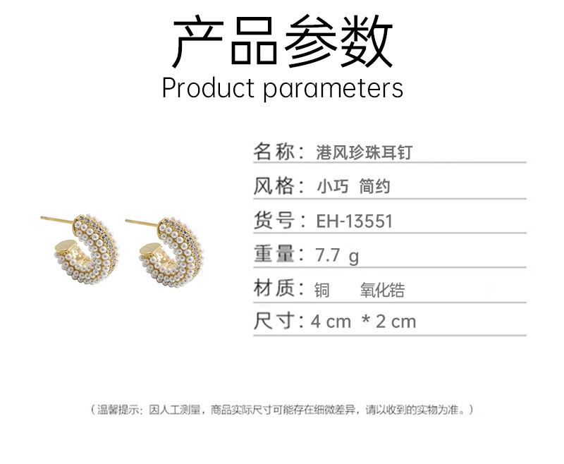 材质: 仿珍珠 处理工艺: 微镶 流行元素: 珍珠 风格: 简约 造型: U形 货号: EH-13551 产地: 义乌 主要下游平台: 淘宝,亚马逊,快手,天猫,抖音 颜色: 金色,银色 是否跨境出口专供货源: 是 上市年份/季节: 2023年秋季 风格分类: 时尚通勤 主要销售地区: 欧洲,南美,东南亚,北美,东北亚,中东 适用人群: 女式 流行元素分类: 自然 重量: 0.05 kg/对