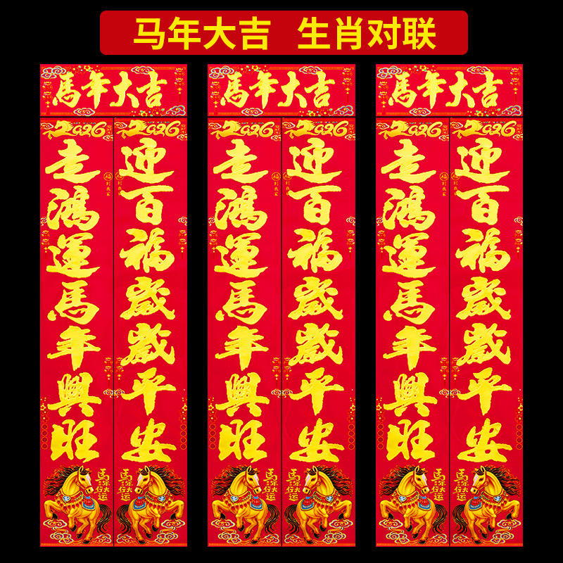 义乌市腾吉对联厂家直销,专业生产对联,一手货源,2026马年新款春节对联,本厂家生产各种春节对联,大礼包福字,生肖,红包,门神,窗花,门贴,挂件等春节各种年货用品 买家请注意:春联规格和实际尺寸是不一样的哦,具体尺寸联系客服了解或者看产品详情里面的注明。