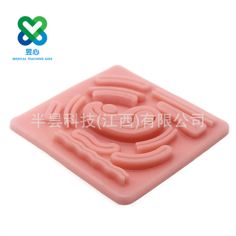 腹腔镜训练多伤口硅胶缝合模型是一款模拟腹腔真实伤口的医学教具。它采用柔软的硅胶材料制作,逼真地呈现了腹腔伤口的形状和缝合过程。硅胶缝合训练适用于练习者练习外科切割、缝合和打结等技术。含有复合材料使劲拉扯打结线时不会出现硅胶断裂的情况。仿真的皮肤质感,耐用且易于清洁,使用时您可以根据需要添加各种伤口进行模拟切割缝合练习。产品可以多次使用。