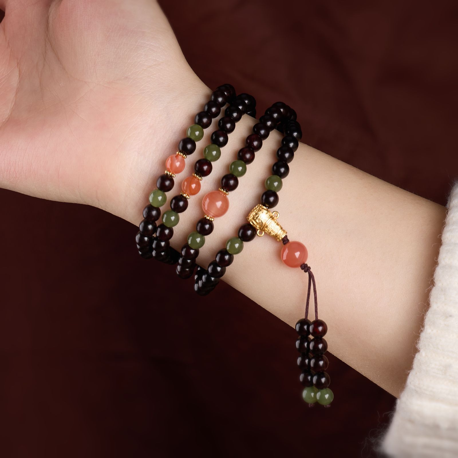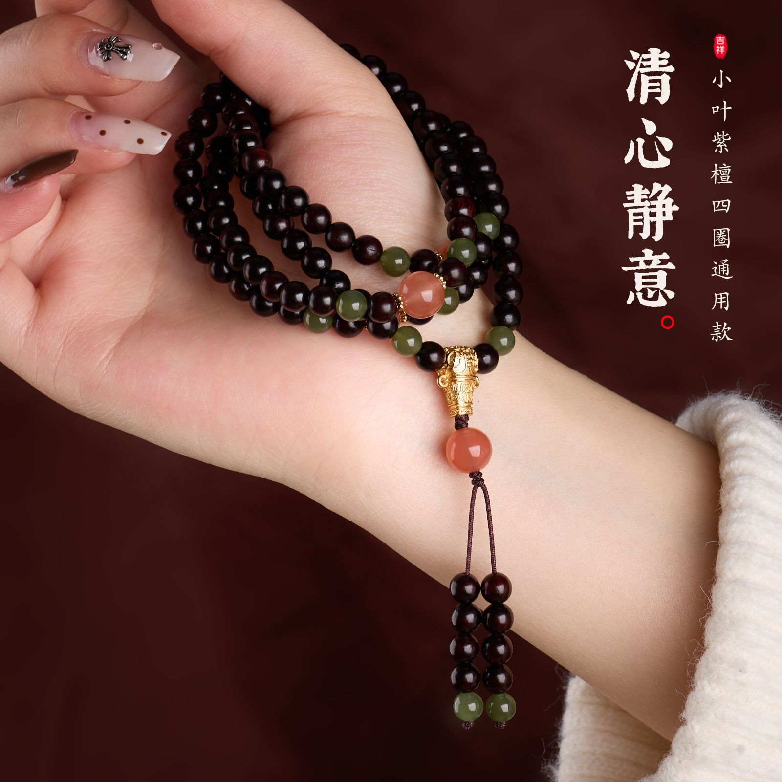 |名称|6MM小叶紫檀108颗 和田玉 南红玛瑙 四圈手链