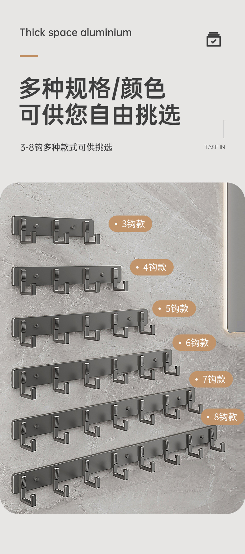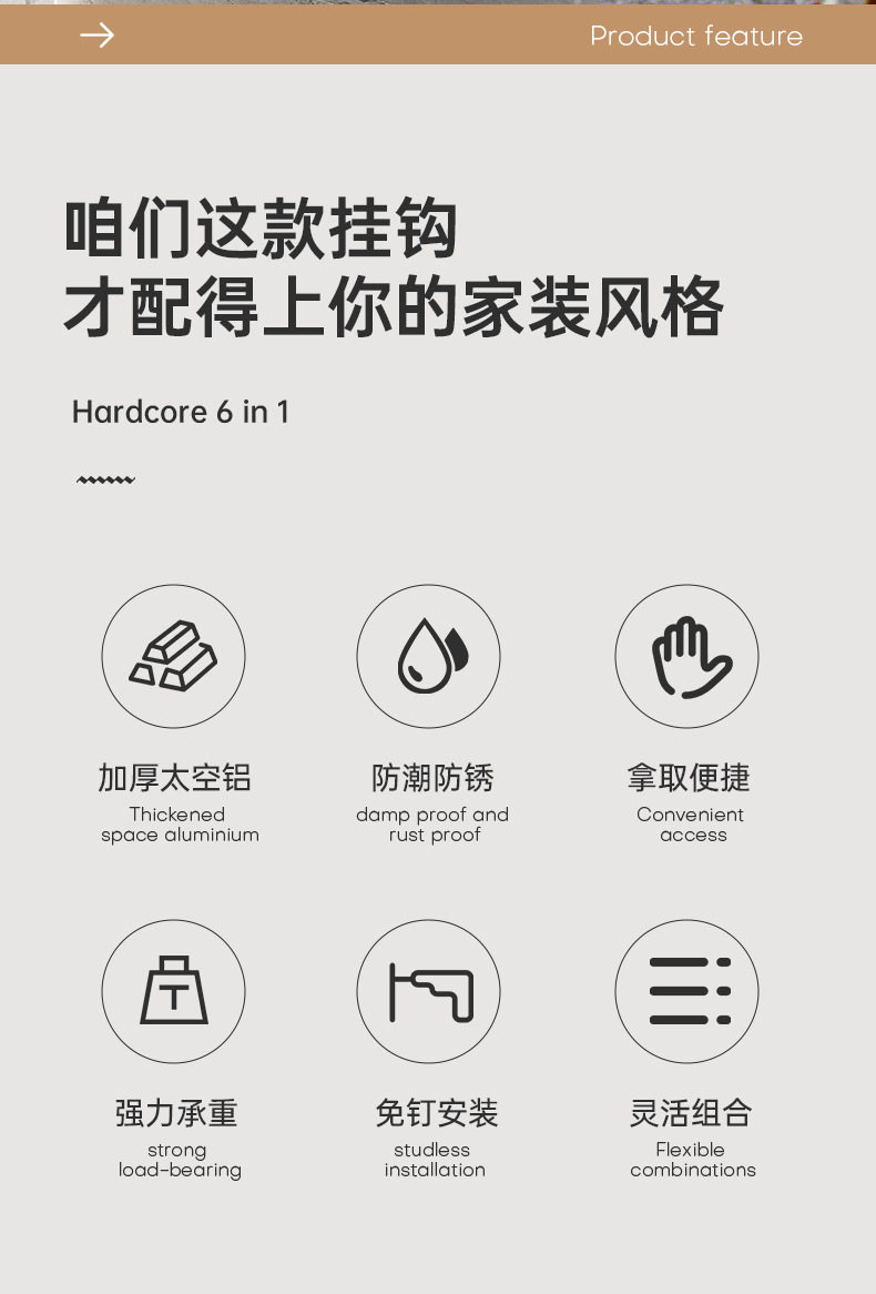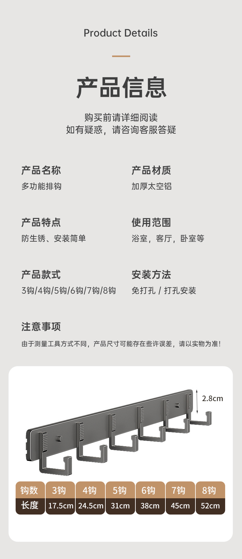 材质: 太空铝 产品类别: 挂钩 款式: 三个以上排钩 个数: 3-8 最大承重: 5-10kg(含) 是否进口: 否 颜色: 银3钩,银4钩,银5钩,银6钩,银7钩, 货号: ZC5500 价格段: 5-10元 产品上市时间: 2025 专利: 否 主要下游平台: ebay,亚马逊,wish,速卖通,独立 主要销售地区: 非洲,欧洲,南美,东南亚,北美,东北亚, 是否跨境出口专供货源: 是 风格: 现代简约 重量: 0.2 kg/件