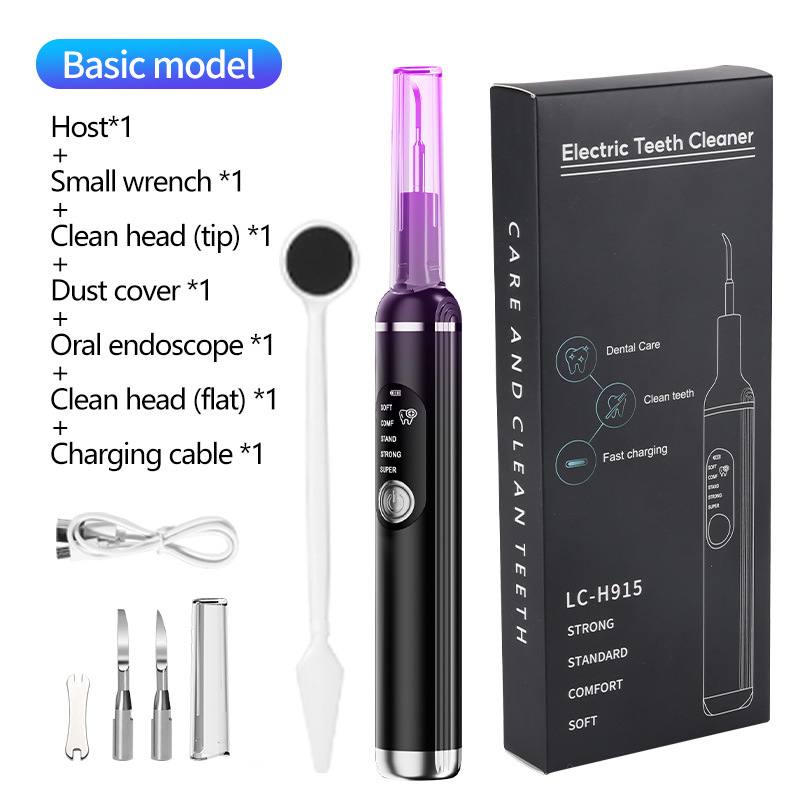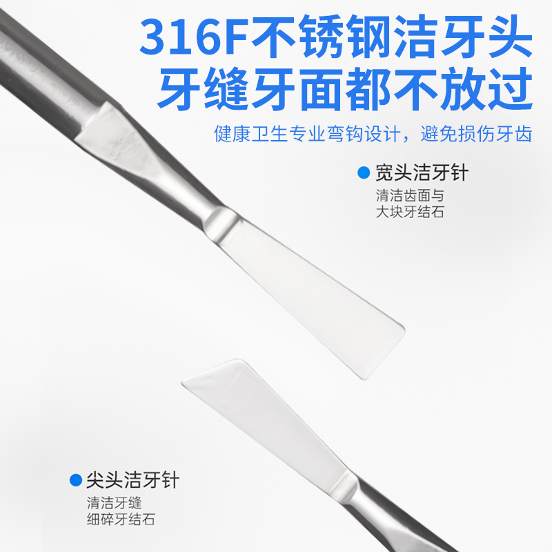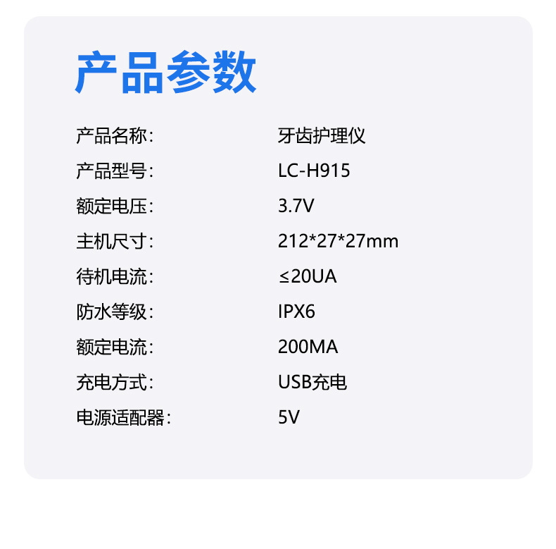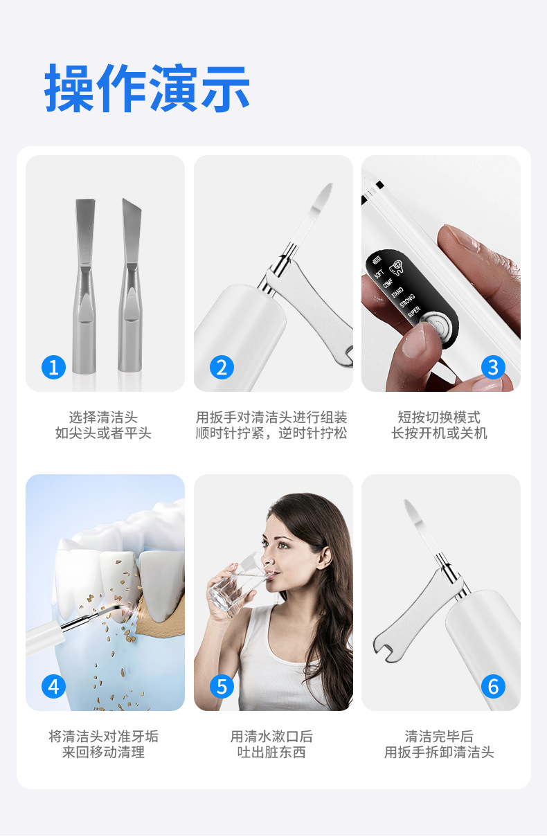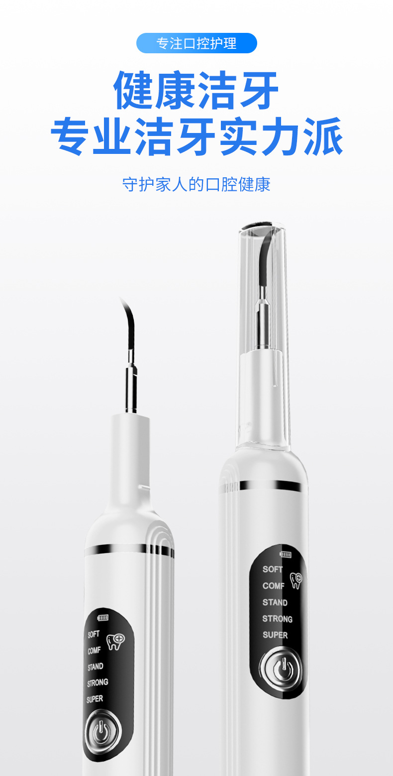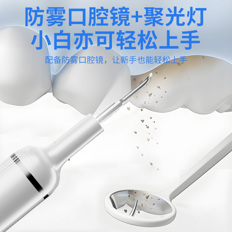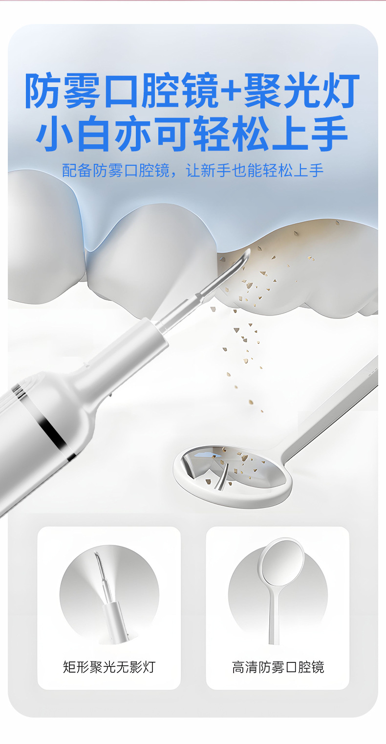 包装清单:洁牙器主机*1,不锈钢尖头*2,不锈钢平头*2,口腔镜*1