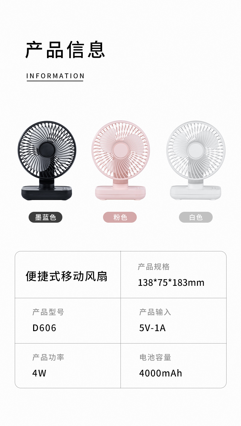电源方式: 锂电池 风扇分类: 桌面风扇 续航时长: 6-8h(含) 风速档位: 4档 噪音: 45dB(A)-50dB(A)(含) 附加功能: 3235341 规格: 36台/箱 额定电压: 5 额定功率: 4 品牌: DIEDOU 操作方式: 普通按钮 是否支持充电: 支持 包装体积: 142*81*187mm 颜色: 白色,粉色,墨蓝色 货号: D606 主要销售地区: 其他 是否跨境出口专供货源: 是 是否内置电池: 内置电池 内置蓄电池容量: 2000mAh-4000mAh(含) 是否专利货源: 否 重量: 0.1 kg/台
