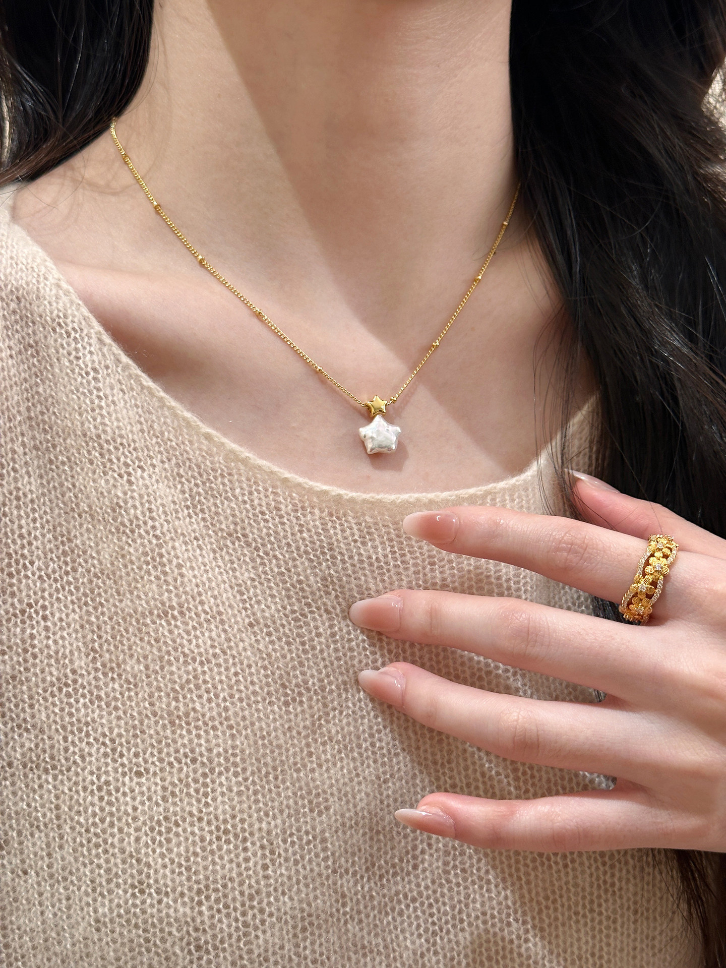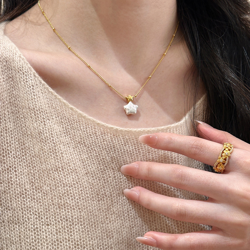 材质: 仿珍珠 处理工艺: 电镀 链子样式: 锁骨链 坠子材质: 仿珍珠 品牌: 丰美饰品厂 流行元素: 星星 造型: 星形 货号: 7-HN11034-1 产地: 义乌 是否多层: 否 周长: 41cm(含)-50cm(含) 颜色: 项链-金色 有可授权的自有品牌: 是 是否跨境出口专供货源: 是 上市年份/季节: 2025年冬季 风格: 轻奢风 重量: 3.7g 风格分类: 时尚通勤 适用人群: 女式 流行元素分类: 自然 重量: 0.5 kg/条